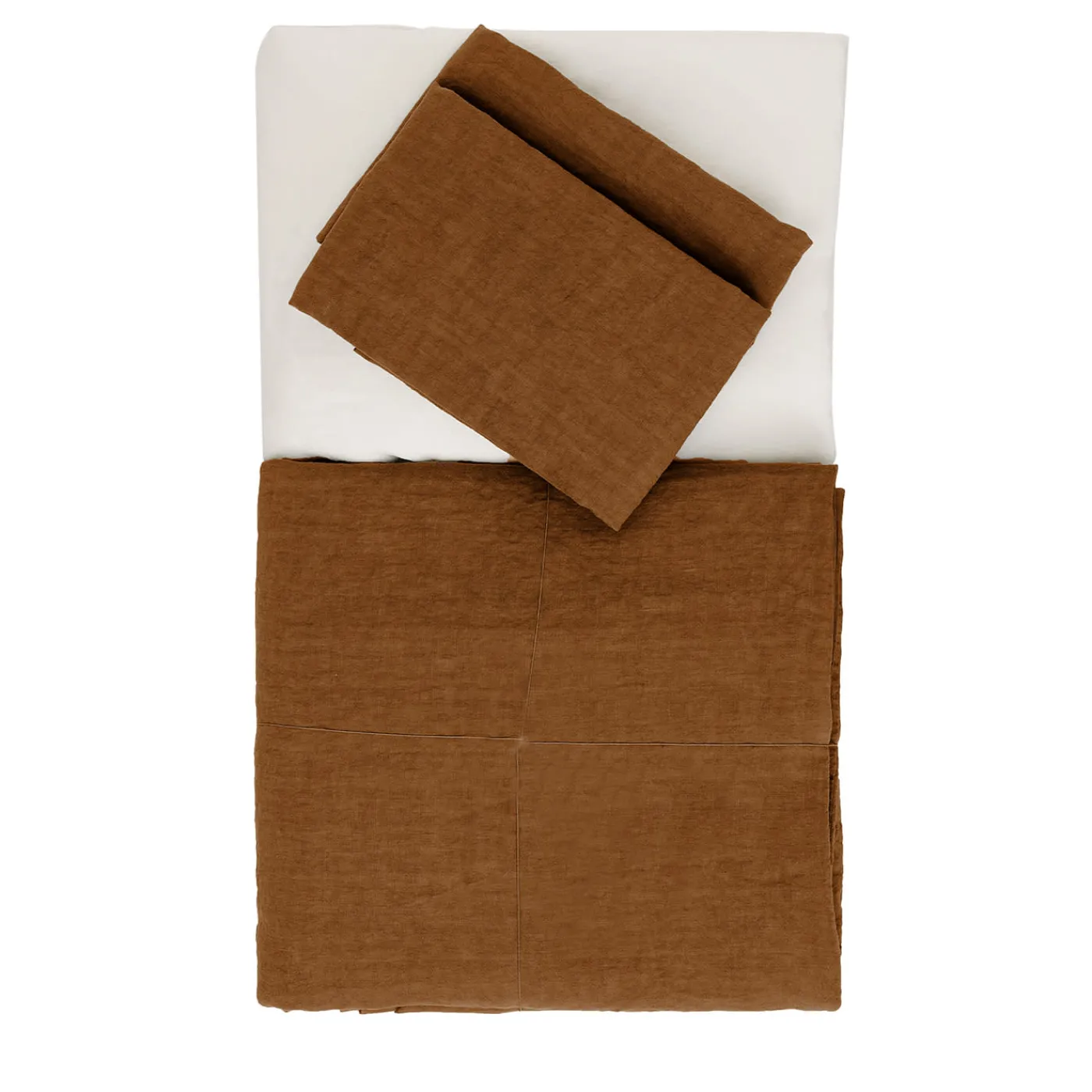 Elegante e colorato, interamente realizzato a mano con il lino più pregiato, questo set è composto da un copripiumino con federe abbinate, tinte in un sofisticato marrone salvia, e da un lenzuolo bianco che si adatta a un materasso profondo 30 cm. La delicata tonalità del marrone è rilassante e ideale da abbinare a una stanza dipinta e arredata con colori neutri. Disponibile in diverse misure: chiedete al concierge i prezzi e i dettagli.