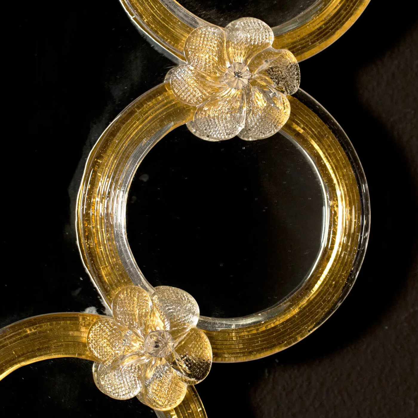 Anelli dorati in vetro di Murano compongono la cornice di questo grazioso specchio rotondo di Ongaro e Fuga. Il decoro è saldato al pannello di base in legno grazie a dettagliati fiori di vetro che uniscono ciascuno degli anelli, dando così un senso di tradizione a un design piuttosto moderno. Questo pezzo aggiunge la giusta dose di glamour a un piccolo spazio.