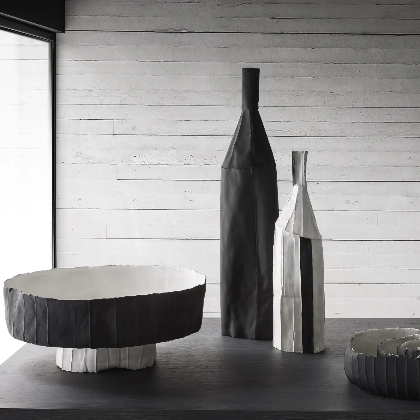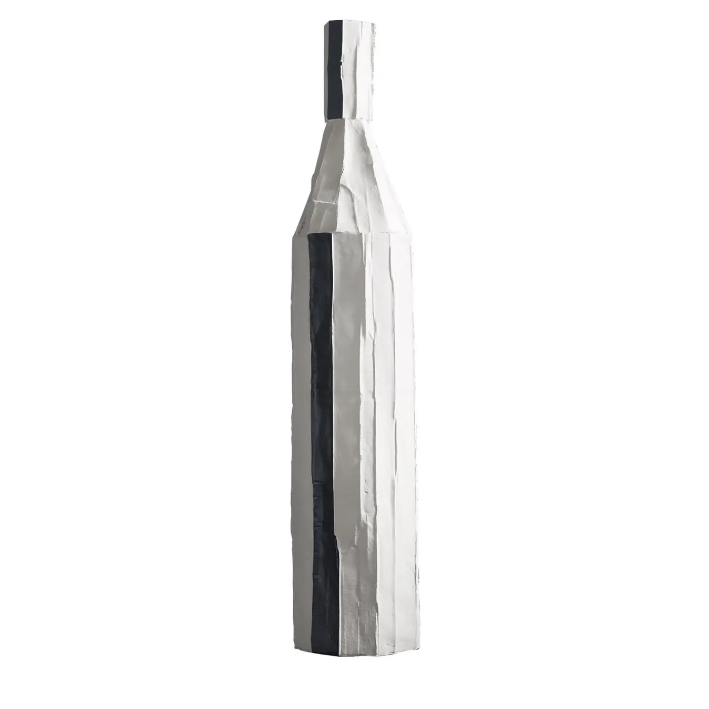 La classica forma di una bottiglia in una classica combinazione di blocchi di colore bianco e nero assume un aspetto completamente nuovo in questo pezzo sorprendente. La sua texture unica deriva dalla paper clay, un materiale ottenuto aggiungendo polpa di carta e fibre naturali a una base di argilla. I segmenti verticali esaltano la qualità dinamica del pezzo, mentre gli inserti neri creano un contrasto accattivante sulla superficie bianca. Questo pezzo è unico e le piccole imperfezioni ne garantiscono l’esclusività. Ogni creazione di Paola Paronetto è unica. Lievi variazioni di forma, colore e dimensione sono da considerarsi una garanzia di autenticità e valore. Sono rifinite con smalti satinati atossici. Anche se molto raramente, è possibile che si verifichino perdite dopo una lunga esposizione all’acqua. È quindi consigliabile testarne la resistenza all’acqua prima di utilizzarli su superfici delicate. Non devono essere utilizzati come utensili da pranzo. I pezzi bianchi possono essere lavati con acqua o prodotti igienizzanti, mentre i pezzi colorati devono essere trattati con maggiore delicatezza e puliti con uno spolverino di piume o un panno morbido, asciutto o inumidito molto leggermente con acqua.