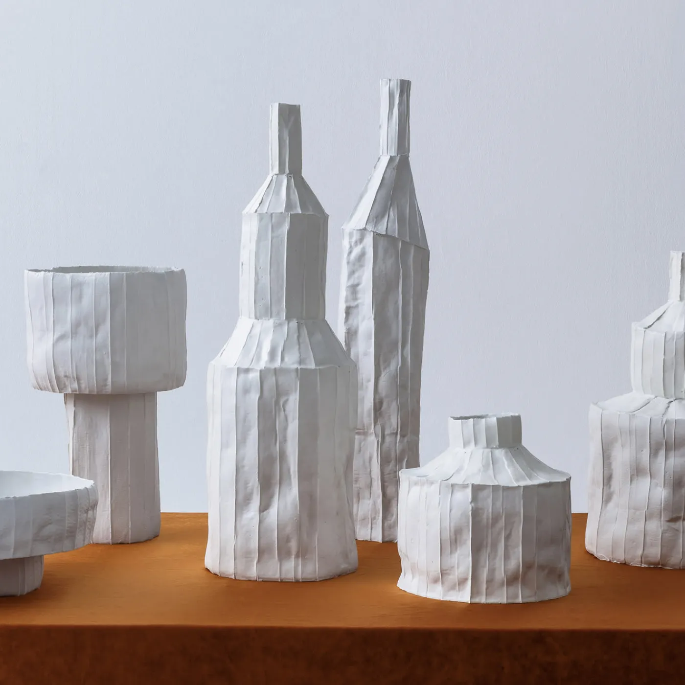 Parte della serie di sculture Fide, ispirate alla maestosa architettura delle cattedrali, questo pezzo a forma di bottiglia è realizzato a mano in paper clay, una base di argilla con polpa di carta e fibre naturali. La silhouette si erge da tre livelli di forme rotonde di dimensioni decrescenti, con una superficie strutturata da segmenti verticali. Il colore bianco brillante aggiunge un tocco etereo a questo oggetto unico di natura morta che può essere esposto con altri pezzi dello stesso designer per un look raffinato. Ogni creazione di Paola Paronetto è unica. Lievi variazioni di forma, colore e dimensione sono da considerarsi garanzia di autenticità e valore. Sono rifinite con smalti satinati atossici. Anche se molto raramente, è possibile che si verifichino perdite dopo una lunga esposizione all’acqua. È quindi consigliabile testarne la resistenza all’acqua prima di utilizzarli su superfici delicate. Non devono essere utilizzati come utensili da pranzo. I pezzi bianchi possono essere lavati con acqua o prodotti igienizzanti, mentre i pezzi colorati devono essere trattati con maggiore delicatezza e puliti con uno spolverino di piume o un panno morbido, asciutto o inumidito molto leggermente con acqua.