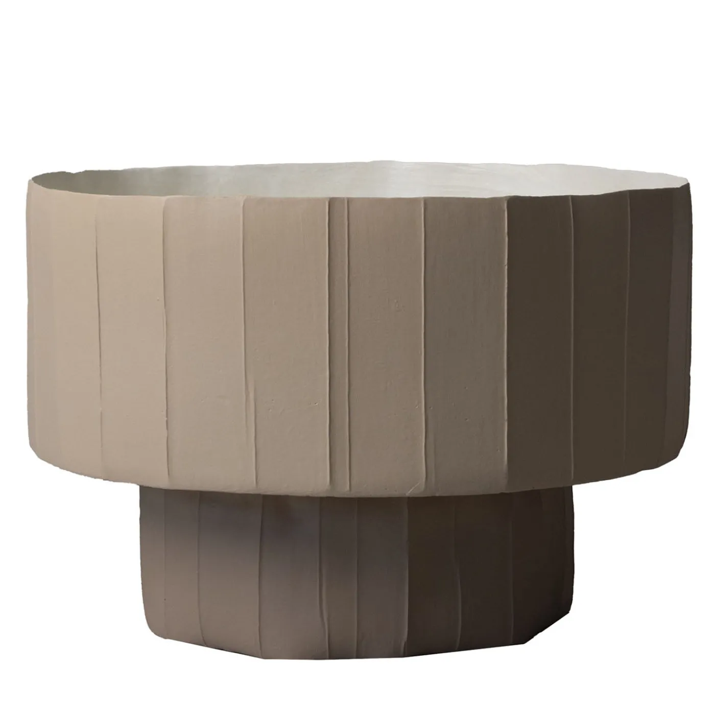 Questa coppa dal design scultoreo si distingue per le eleganti scanalature verticali e la finitura opaca che richiama superfici naturali. La forma equilibrata combina una vasca ampia e bassa con una base solida, rendendola perfetta come centrotavola decorativo. Realizzata attraverso un attento processo artigianale di modellazione e cottura, ogni pezzo presenta sottili variazioni che ne sottolineano l’unicità. Un oggetto raffinato e materico, ideale per arricchire spazi moderni con un tocco artistico e contemporaneo.