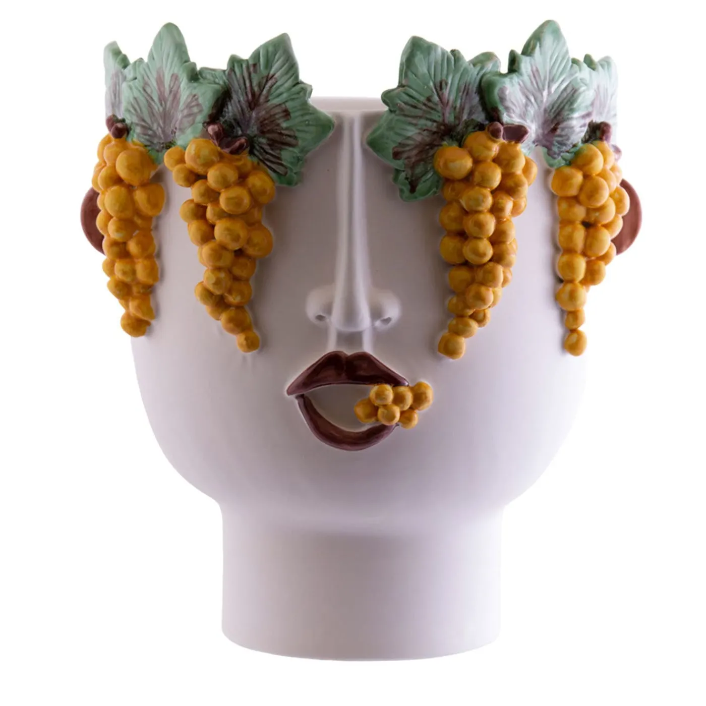 La seconda testa in ceramica cotta a fuoco, realizzata a mano con rilievi di volti e uva bianca, può essere utilizzata per contenere piante, fiori e talvolta anche bottiglie con ghiaccio. Malvasia vende uva bianca al mercato di Palermo, una donna bellissima e sorprendente!