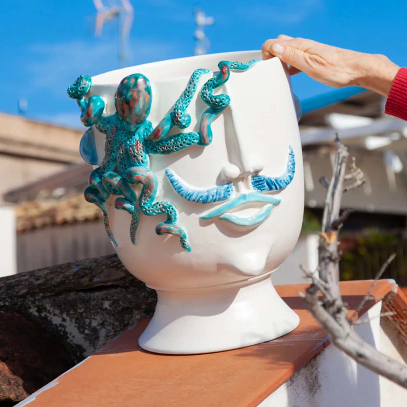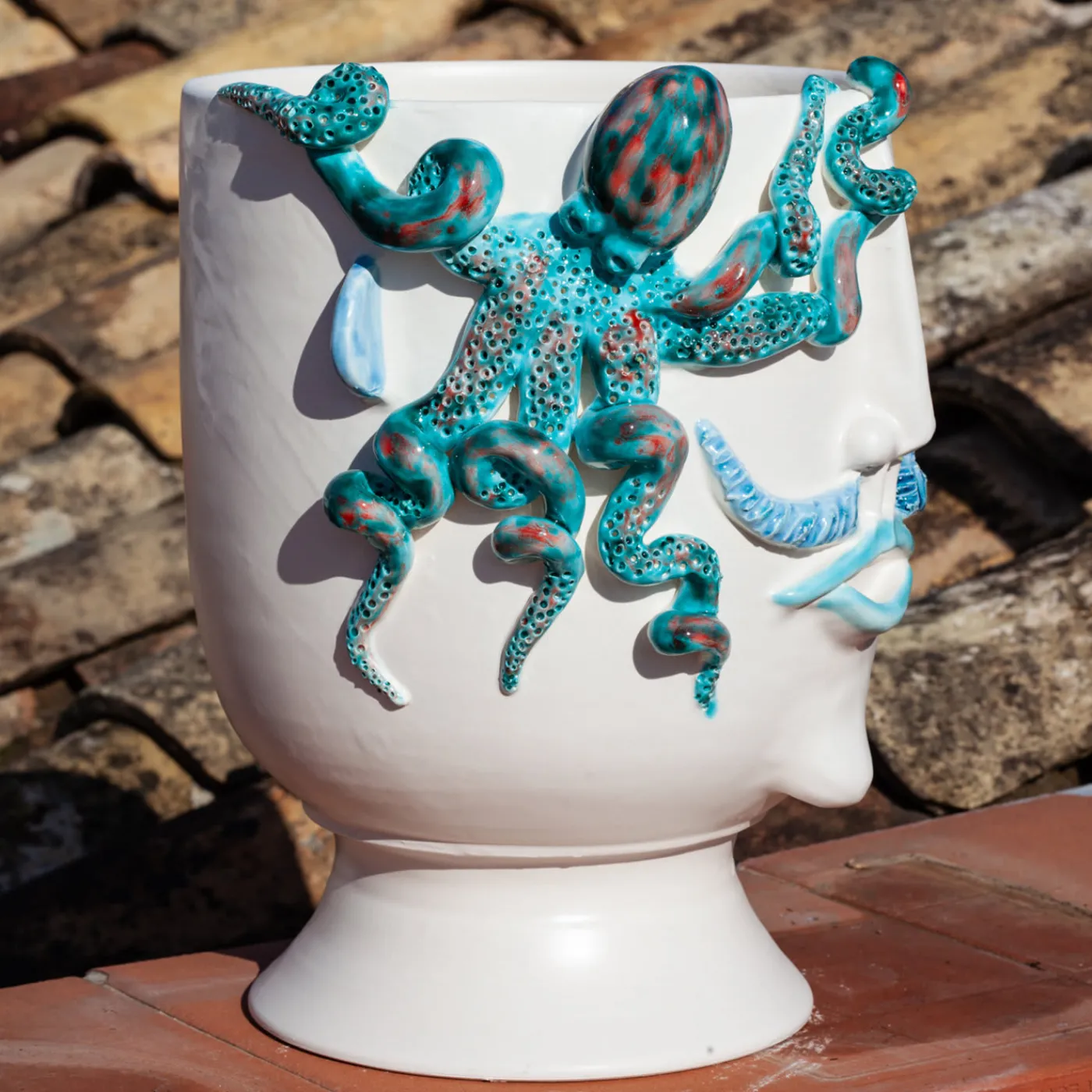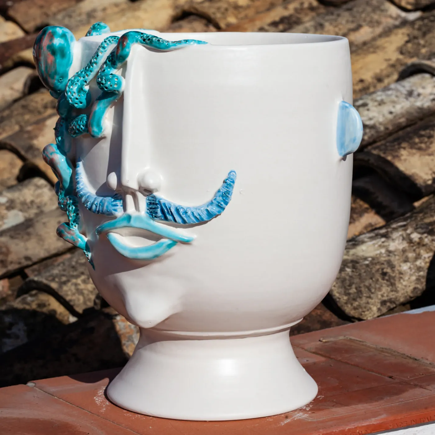 Un pezzo ideale per accentuare gli arredi costieri, questo sofisticato design in fine ceramica bianca opaca è contemporaneamente un recipiente e una testa antropomorfa semplicemente decorativa. Mostra un volto maschile – ispirato a Salvo, un venditore ambulante di polpi (“u pulparu” in dialetto siciliano) – con un polpo in 3D che ne adorna il fianco fino al bordo. Gli smalti cristallini nei toni dell’azzurro, del turchese e del rosso sono utilizzati per accentuare i baffi, le labbra e il polpo minuziosamente dettagliato.