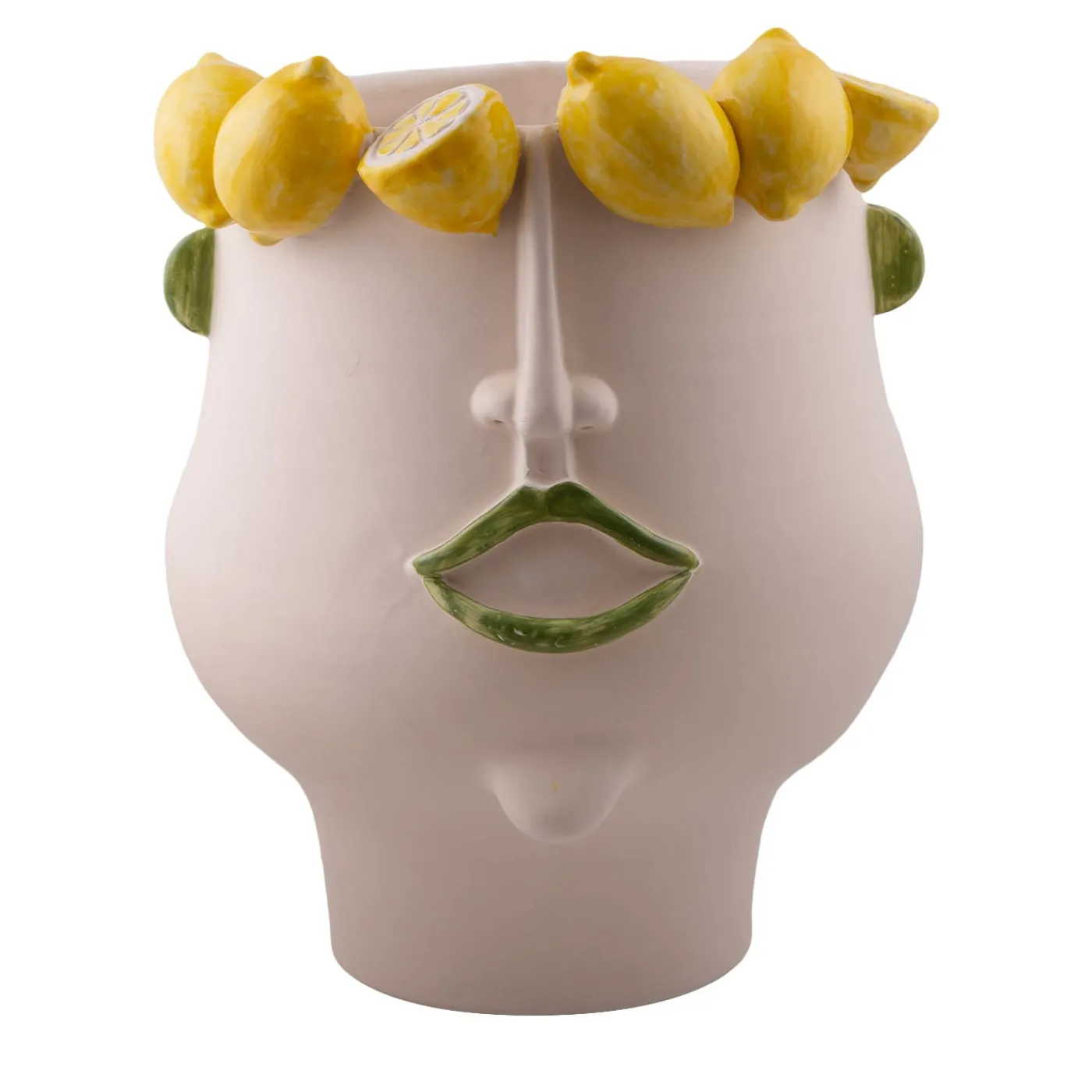 Questo esclusivo vaso a forma di testa in pregiata ceramica bianca celebra la bellezza autentica di un mestiere duro ma affascinante, quello della raccoglitrice di limoni. Ideale come recipiente per uso interno o esterno, raffigura Domitilla, una raccoglitrice di limoni siciliana i cui tratti scolpiti sono accuratamente resi, le labbra sinuose e le orecchie stilizzate accentuate in verde. Il bordo del vaso è ornato da una corona di limoni gialli e vivaci.