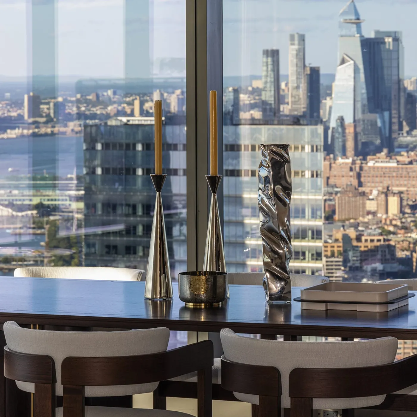 Utilizzato per abbellire un tavolo da pranzo moderno o una consolle d’ingresso, questo sorprendente candeliere porterà il fascino contemporaneo in qualsiasi interno. La silhouette elegante e slanciata evoca una clessidra irregolare, con i due elementi a forma di cono collegati alla sommità, abilmente forgiati a mano in ottone e rifiniti con una placcatura in nichel lucido. Disponibile anche in una misura più piccola, la coppia può essere esposta insieme per un accattivante look alto-basso. Questo pezzo è attualmente in mostra e immediatamente disponibile presso la Galleria Artemest di New York.