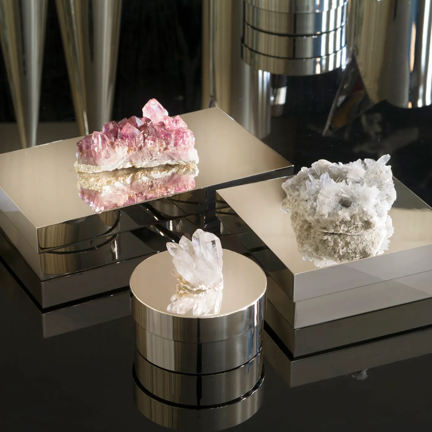 Elegante e funzionale, questo cofanetto rettangolare può essere utilizzato come luogo sofisticato per riporre gioielli o come accento accattivante su un tavolino, una mensola, un comò o una scrivania in un ambiente moderno. Il cofanetto in ottone nichelato vanta una finitura a specchio e presenta un coperchio sollevabile sormontato da una splendida ametista che funge da pomello decorativo. Il morbido rivestimento interno è stato progettato per riporre in modo sicuro gli oggetti più delicati. A causa dell’uso di materiali naturali, la pregiata pietra ametista può variare leggermente nella forma, non nel colore, rispetto all’immagine mostrata.