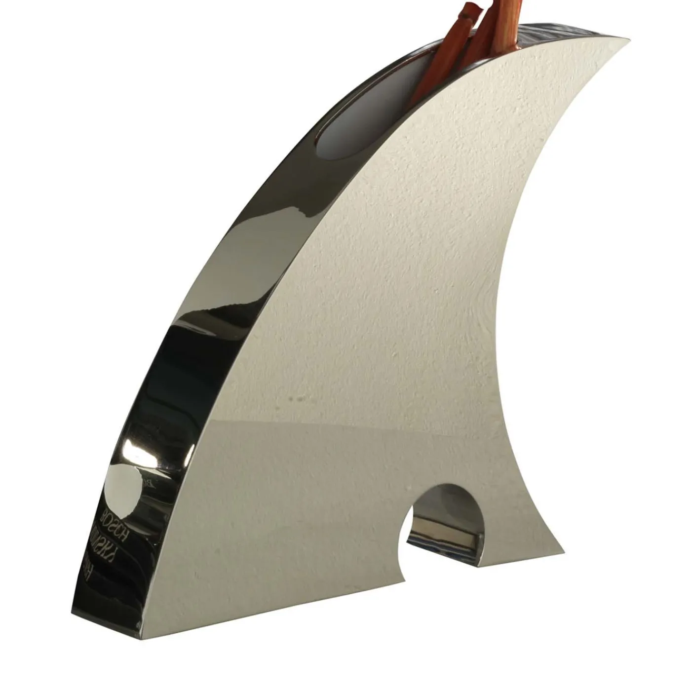 Distinto per il suo design estremamente contemporaneo ed elegante, questo vaso fatto a mano sarà un centrotavola di grande effetto su una console moderna o un tavolino da caffè minimalista. Realizzato in ottone nichelato, questo vaso assume una forma dinamica i cui contorni lisci ricordano una pinna dorsale, catturando lo sguardo con il suo movimento. I lati lunghi del vaso sono rifiniti con una vernice bianca che contrasta elegantemente con l’ottone per un suggestivo effetto materico. Una piccola apertura nella parte superiore rende questo pezzo adatto ad esporre fiori a gambo alto.