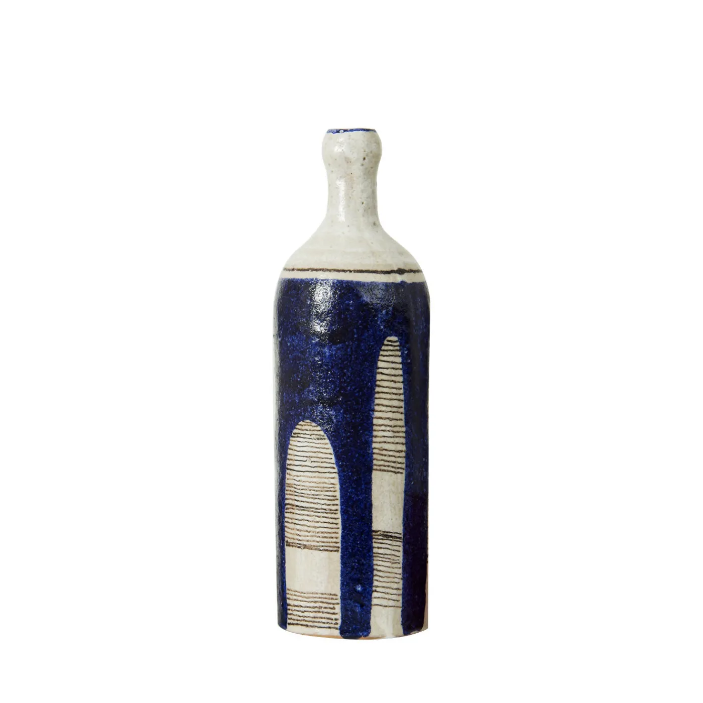 Questa squisita bottiglia è stata interamente realizzata in ceramica e smaltata con antichi metodi artigianali. Lo sfondo bianco è evidenziato da suggestivi motivi blu, ornati qua e là da delicate linee marroni che corrono parallele, creando un effetto dinamico sulla superficie del pezzo. Grazie alla sua esecuzione a mano, nessuna bottiglia sarà esattamente uguale all’altra. Questo pezzo unico è modernità e tradizione allo stesso tempo.
