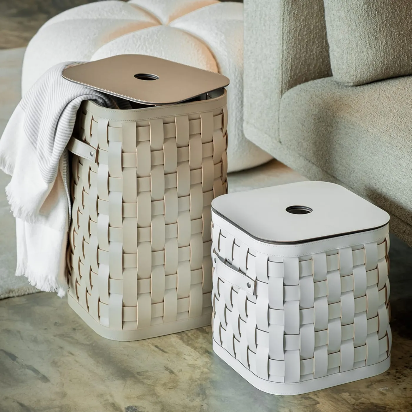 Questo piccolo cesto per la biancheria è alto 50 cm ed è realizzato in pelle grigia intrecciata a mano. È dotato di un coperchio piatto coordinato ed è disponibile in diverse dimensioni e forme. Può essere ulteriormente personalizzato con qualsiasi colore della linea Antibes. Adatto per uso esterno o interno.