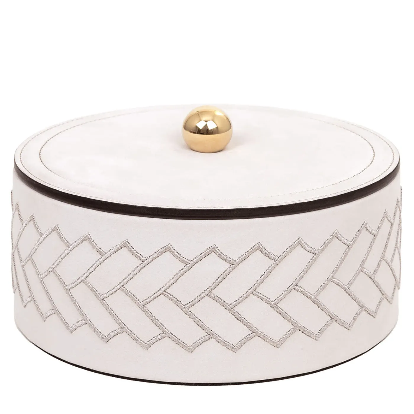 Un elegante ricamo a spina di pesce che emerge dalla pregiata pelle bianca contraddistingue questo prezioso cofanetto. Caratterizzato da un coperchio coordinato con un terminale dorato lucido posto al centro, è la soluzione ideale per raccogliere i gioielli preferiti su una scrivania o un comò. Nel catalogo Artemest sono disponibili diverse dimensioni e opzioni di finitura.