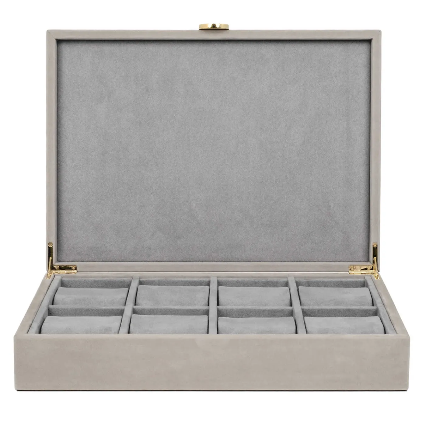 Per gli amanti degli orologi, questo accattivante cofanetto è realizzato in pelle nubuck in un elegante color tortora, con un interno in morbida microfibra. Le brillanti finiture in oro lucido e i graziosi cuscini completano il design, consentendo di contenere fino a 8 orologi. Disponibile in una varietà di colori e pelli. Contattare il concierge per maggiori informazioni.