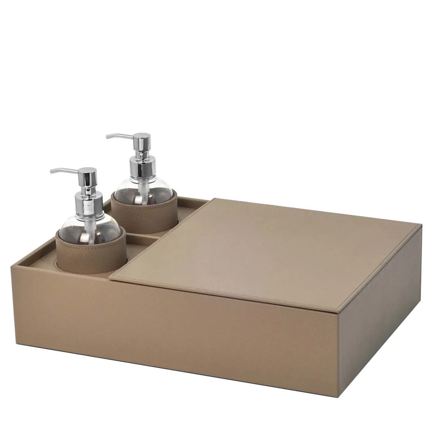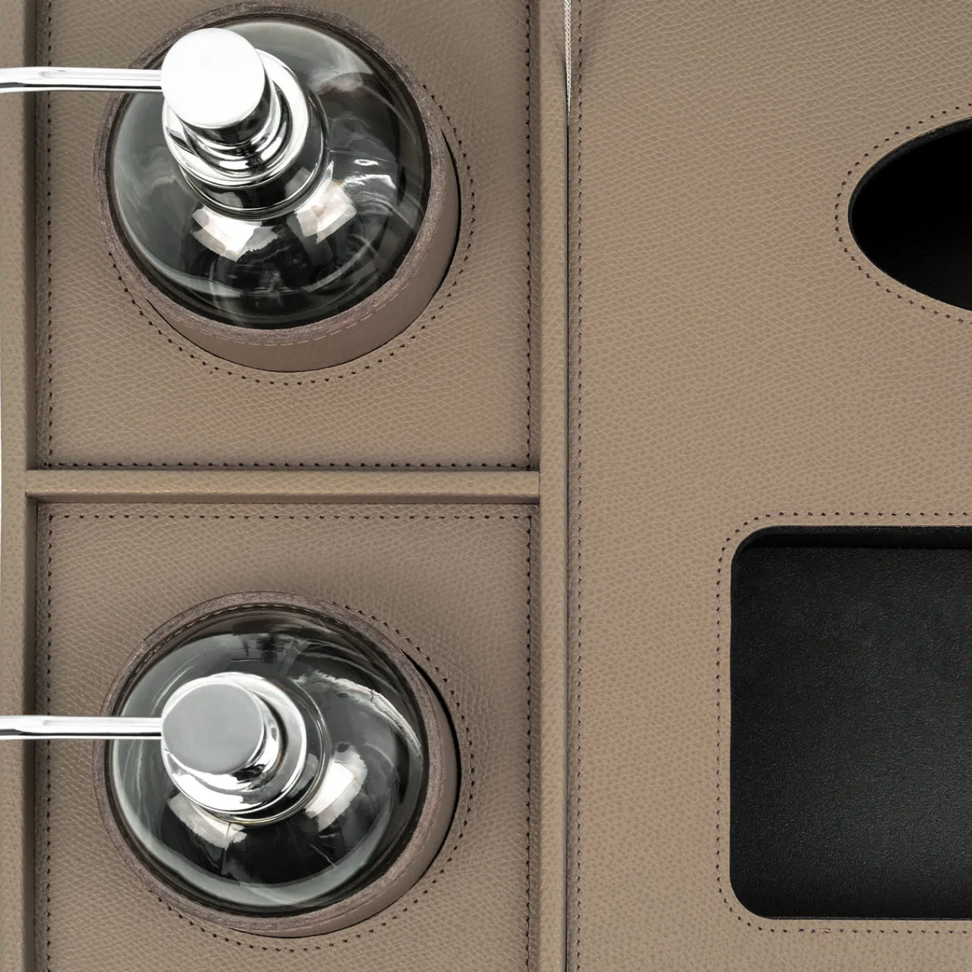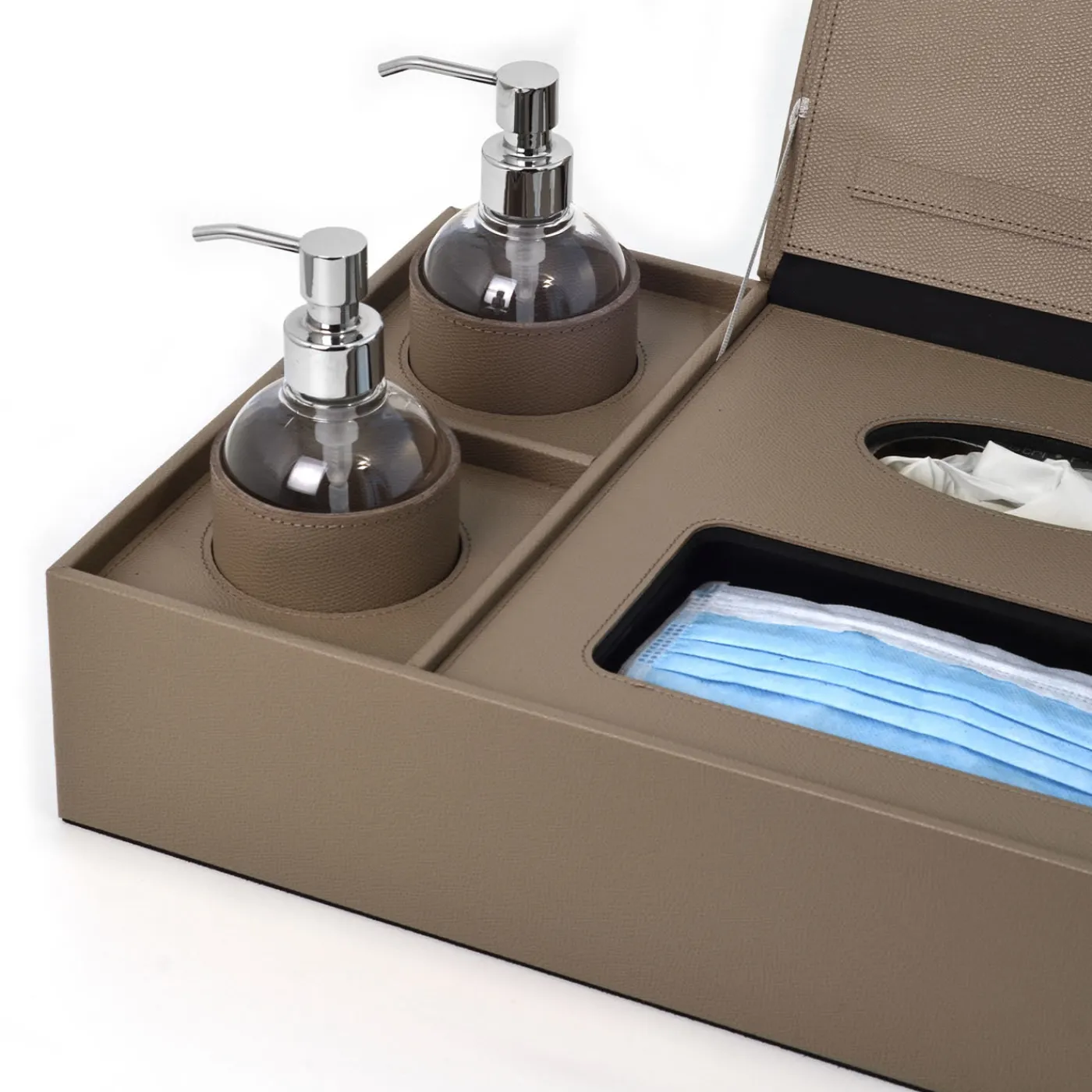 Rivestito in morbida pelle italiana, questo elegante vassoio è una soluzione elegante per interni commerciali e residenziali, progettata per fornire ai vostri ospiti o clienti la disinfezione delle mani e gli accessori per mantenere gli ambienti puliti e igienizzati. Presentato in una versatile tonalità tortora, e disponibile in un’ampia gamma di colori del catalogo Malaga, questo set comprende due flaconi in vetro ricaricabili per il disinfettante per le mani e due scomparti per riporre guanti e maschere monouso sotto il coperchio a cerniera.