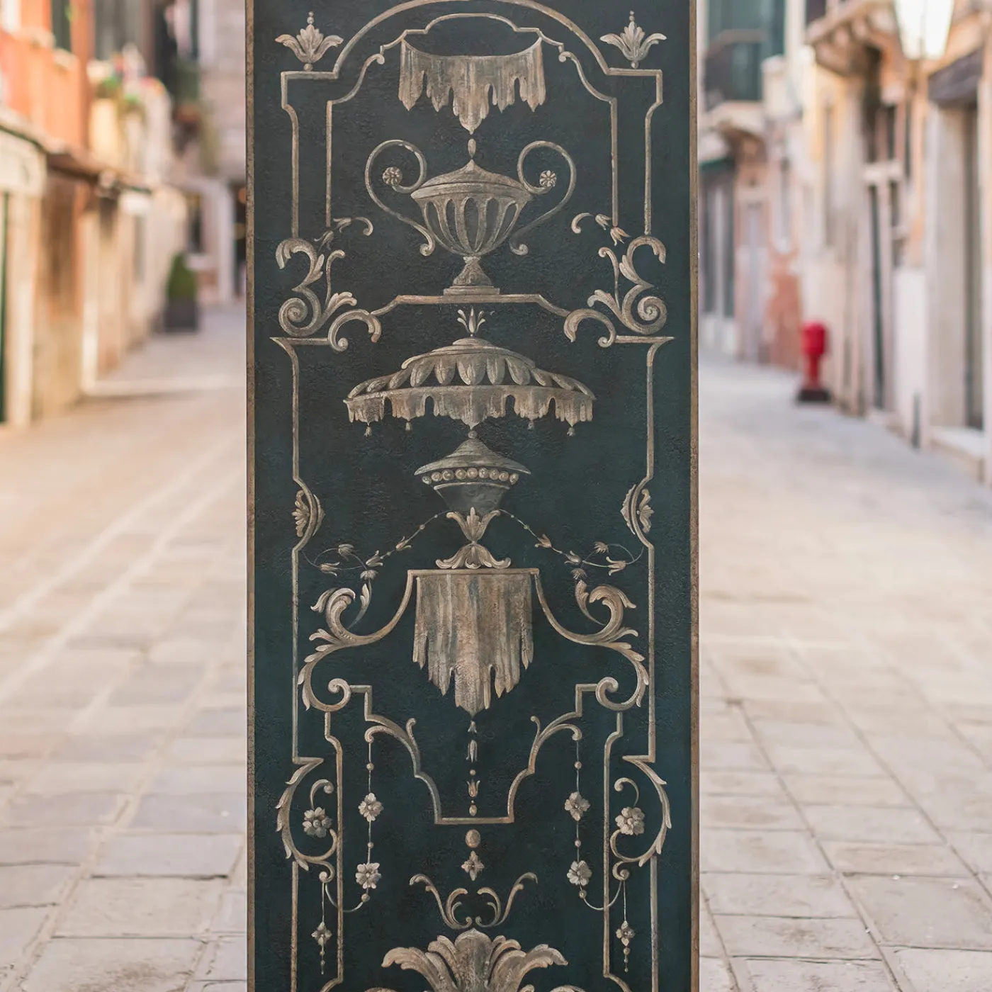 Il pannello, decorato a mano in stile veneziano, è il complemento perfetto per qualsiasi stile di arredamento per un ambiente raffinato. Colori e decorazioni possono essere personalizzati su richiesta del cliente, per abbinare perfettamente questa creazione al resto dell’ambiente. È inoltre possibile richiedere variazioni nelle dimensioni, in quanto tutte le nostre creazioni sono realizzate dai nostri artigiani.