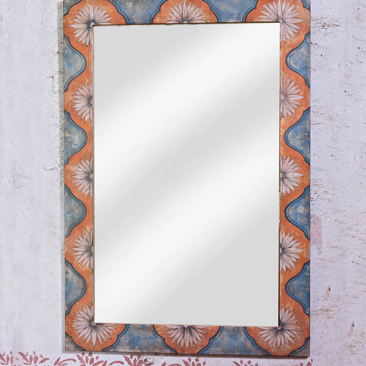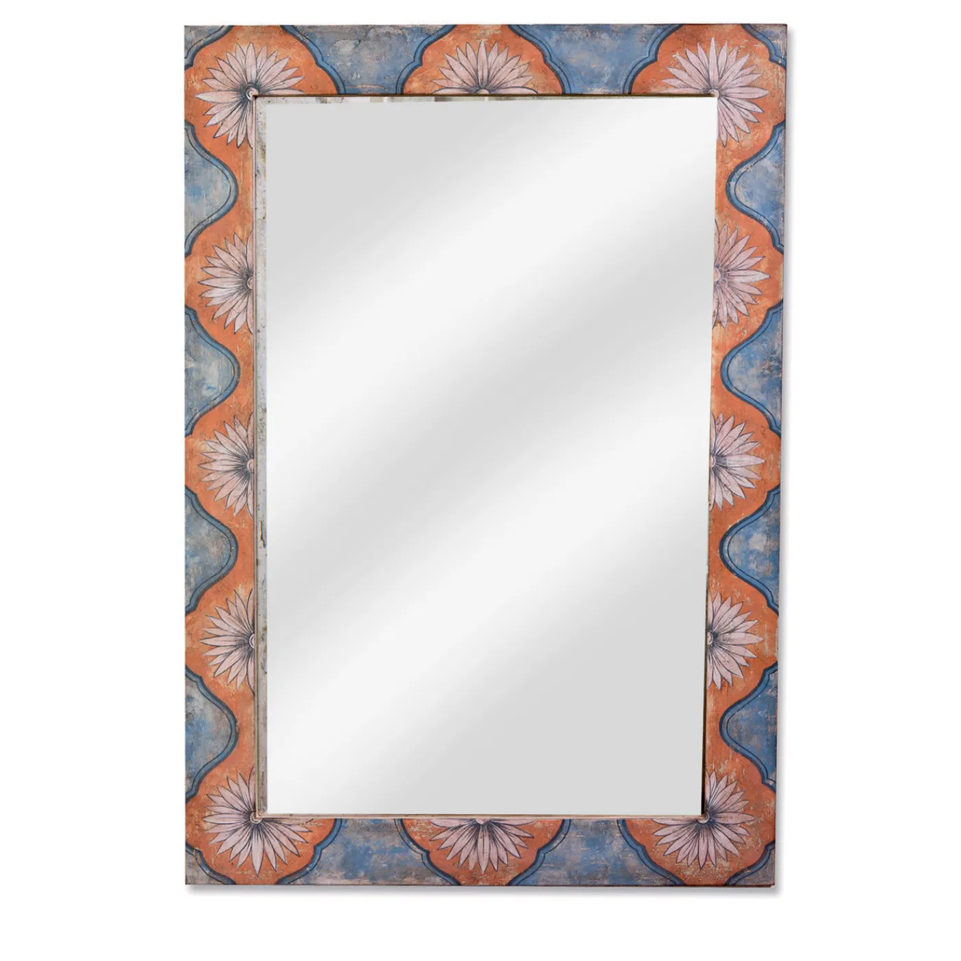 Mozzafiato nella sua semplicità, questo grande specchio in stile veneziano è realizzato in legno e presenta una decorazione dipinta a mano di fiori bianchi in una cornice arancione sagomata che spicca su un morbido sfondo azzurro. Un pezzo davvero unico ed elegante, la finitura anticata evoca il fascino originale degli stili del XVIII secolo, pur mantenendo un aspetto moderno. Questa interessante combinazione fa bella mostra di sé in un ingresso, in un soggiorno o in una camera da letto. Dimensioni, colore e motivo possono essere personalizzati su richiesta e lo specchio può essere offerto anche in finitura anticata.