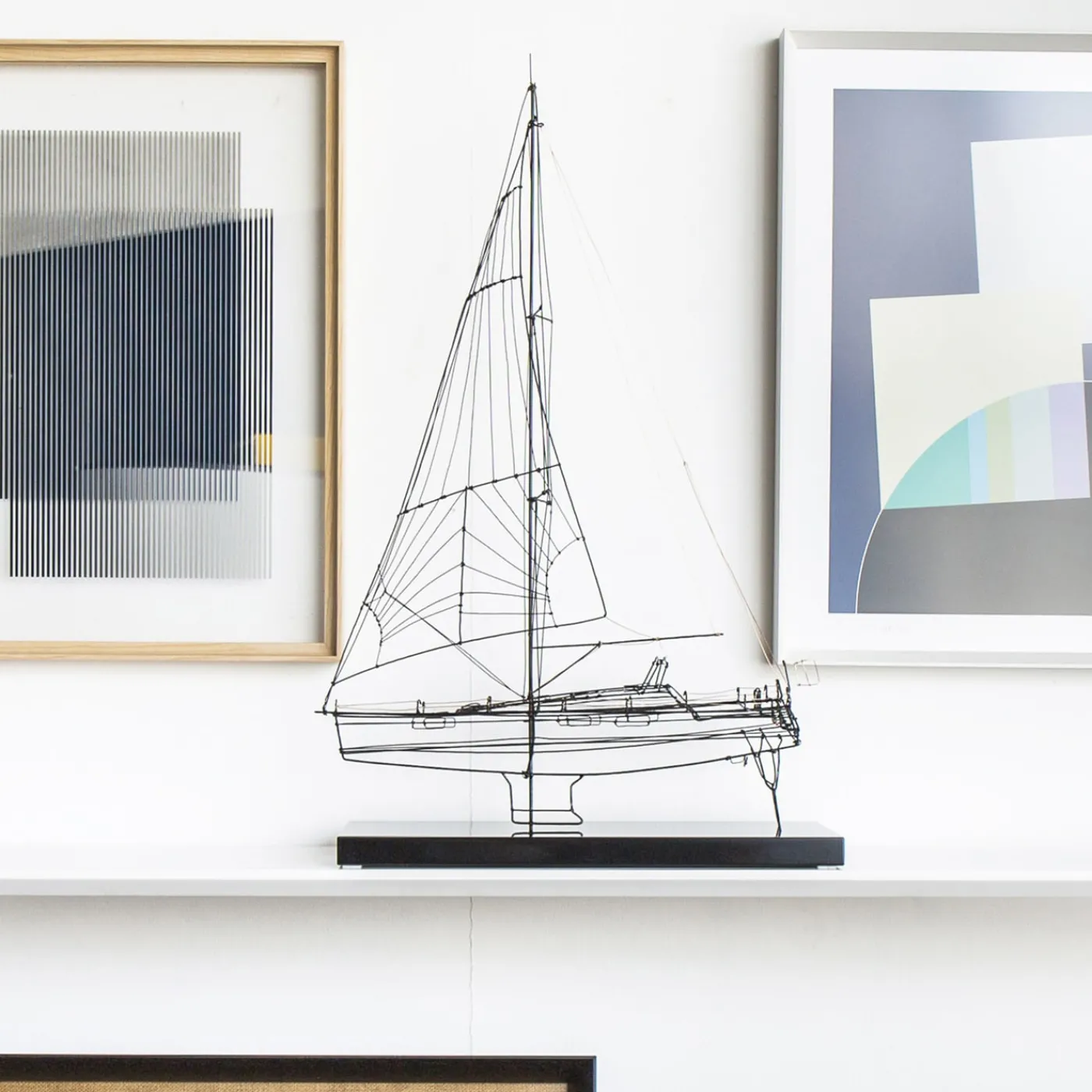 Idea regalo perfetta per un amante del mare, questa stupenda statuetta raffigura una barca a vela Dufour, realizzata a mano in filo di ferro nero arricchito da dettagli in argento e bronzo. Poggia su una base nera lucida con specchio, che ne evidenzia il fascino singolare e sontuoso. Il modello della barca è personalizzabile, si prega di consultare il Concierge per i dettagli.