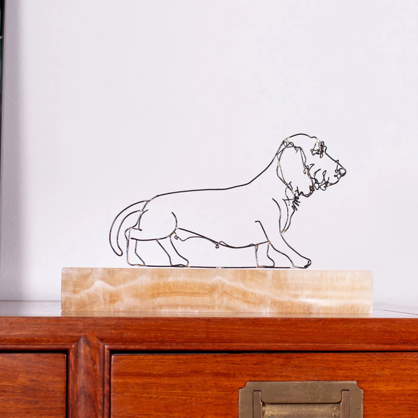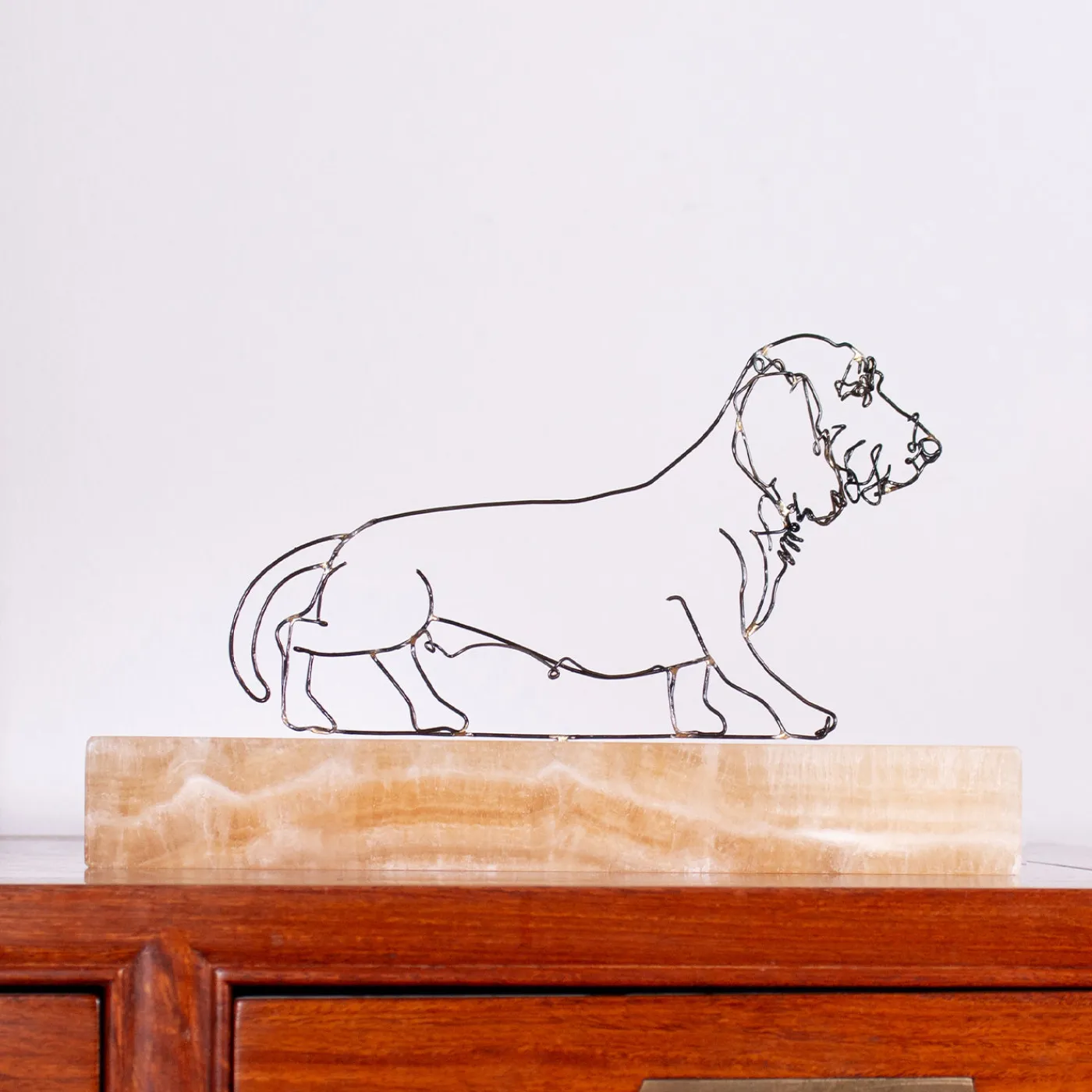Questa scultura contemporanea e distintiva presenta un bassotto realizzato in filo di metallo nero, dal design minimalista ma espressivo. La figura poggia su una base di Onice cappuccino lucido che aggiunge calore ed eleganza. Disponibile per personalizzazione a partire da fotografie per rappresentare qualsiasi cane. Disponibili oltre 69 razze canine con ulteriori opzioni di personalizzazione. Per maggiori informazioni si prega di contattare il Concierge.