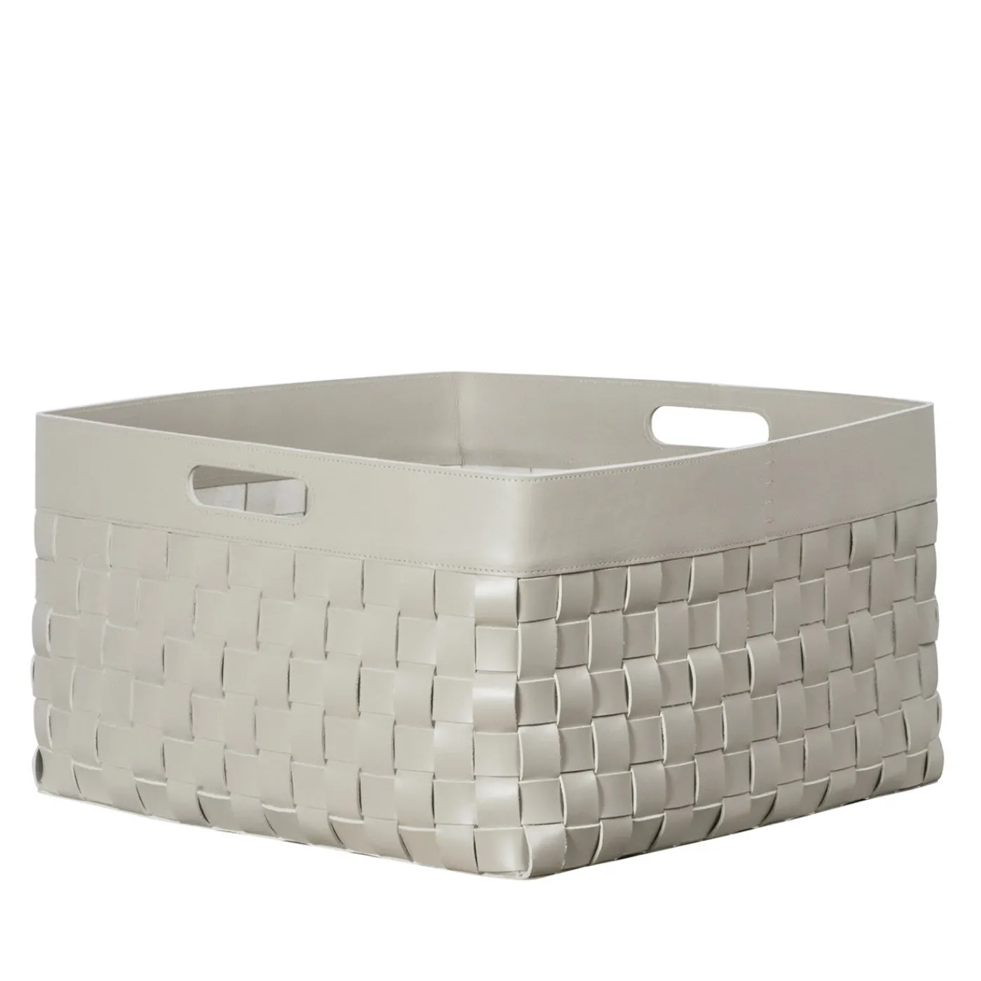 Parte della serie Verona, questo grande cesto è un oggetto perfetto per riporre una varietà di oggetti diversi in modo elegante e sofisticato. La struttura è interamente realizzata in pelle di sella, trattata con tinture vegetali per conferirle il colore grigio chiaro. Le strisce di pelle pregiata sono intrecciate in una texture di grande effetto e culminano nell’anello superiore liscio, dotato di due pratiche maniglie per una facile presa. Per finiture alternative, contattare il Concierge.