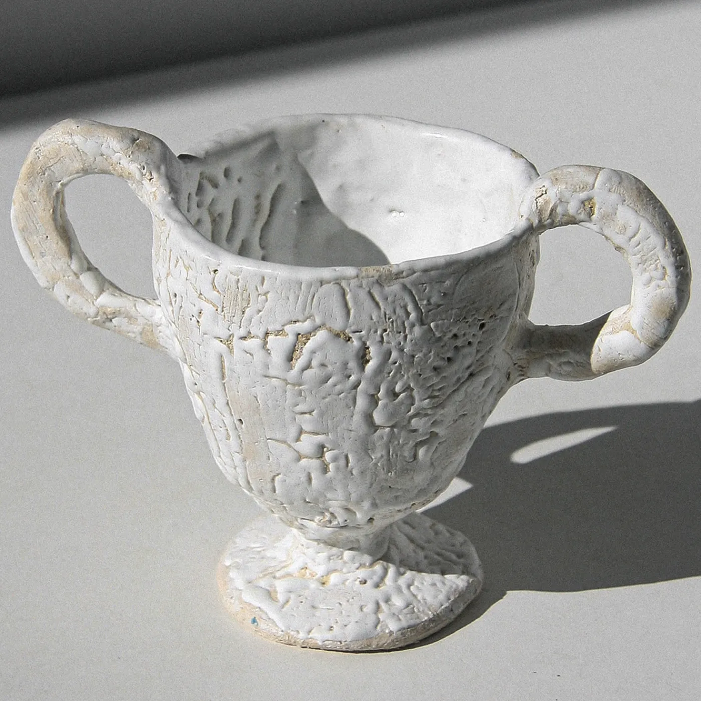 Sorprendente sintesi di classico e contemporaneo, questa singolare coppa in terracotta realizzata con la tecnica dell’arrotolamento ricorda gli antichi calici, ma è resa con un aspetto volutamente non raffinato. Le intense irregolarità che definiscono la superficie creano un piacevole effetto di luci e ombre che si estende alle armoniose anse laterali. Squisito come pezzo decorativo ma anche come zuccheriera. Si prega di fare attenzione all’acqua, poiché non è impermeabile né lavabile in lavastoviglie.