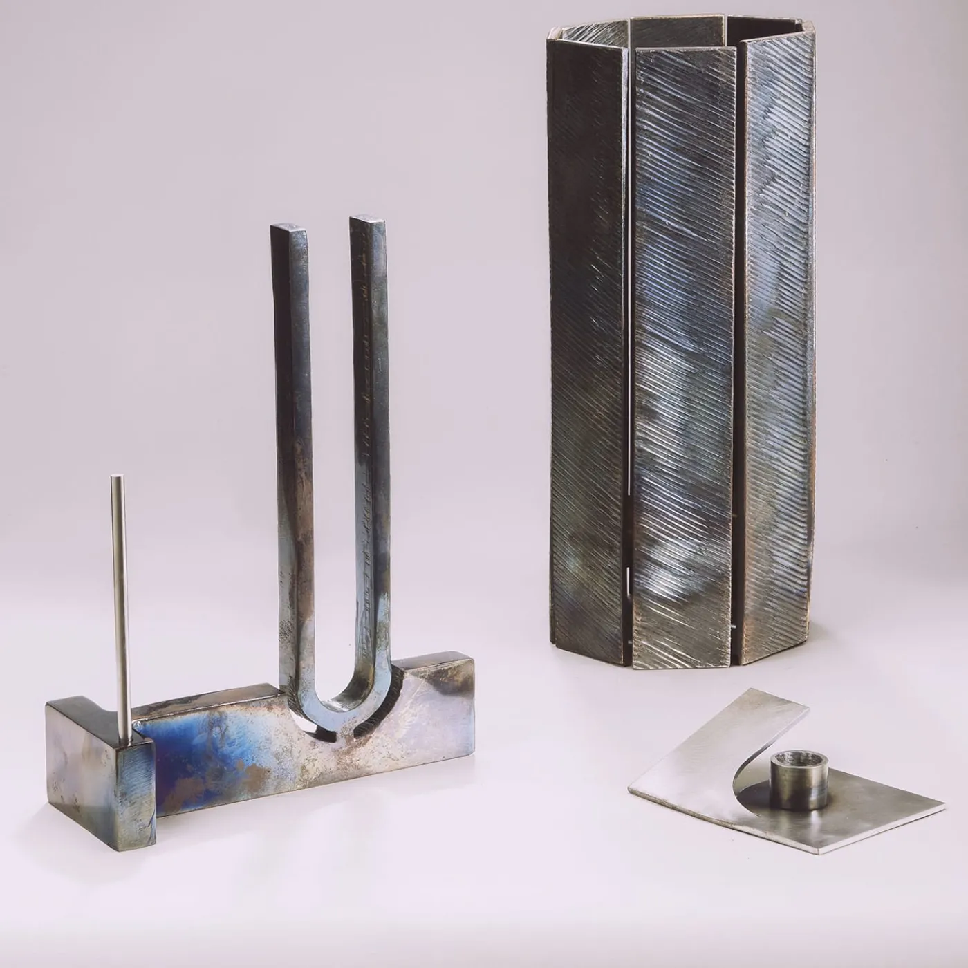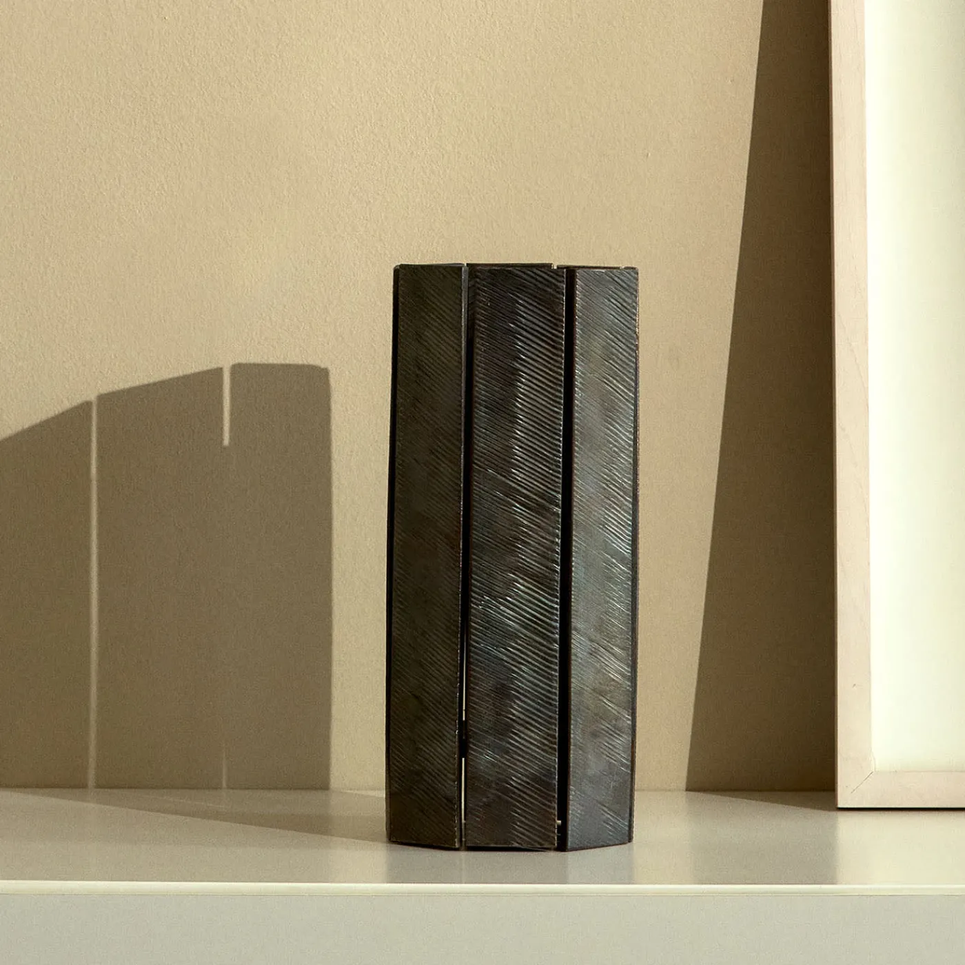 Essenza è un ponte tra la forza del metallo e l’accogliente familiarità del legno. Realizzato con cura, racconta il loro incontro attraverso una superficie originariamente liscia che nasconde piccoli nodi e scanalature, invitando all’esplorazione tattile tra il freddo metallo e la memoria evocativa del legno. Questa fusione sfida le aspettative, componendo una sinfonia tattile di materiali.