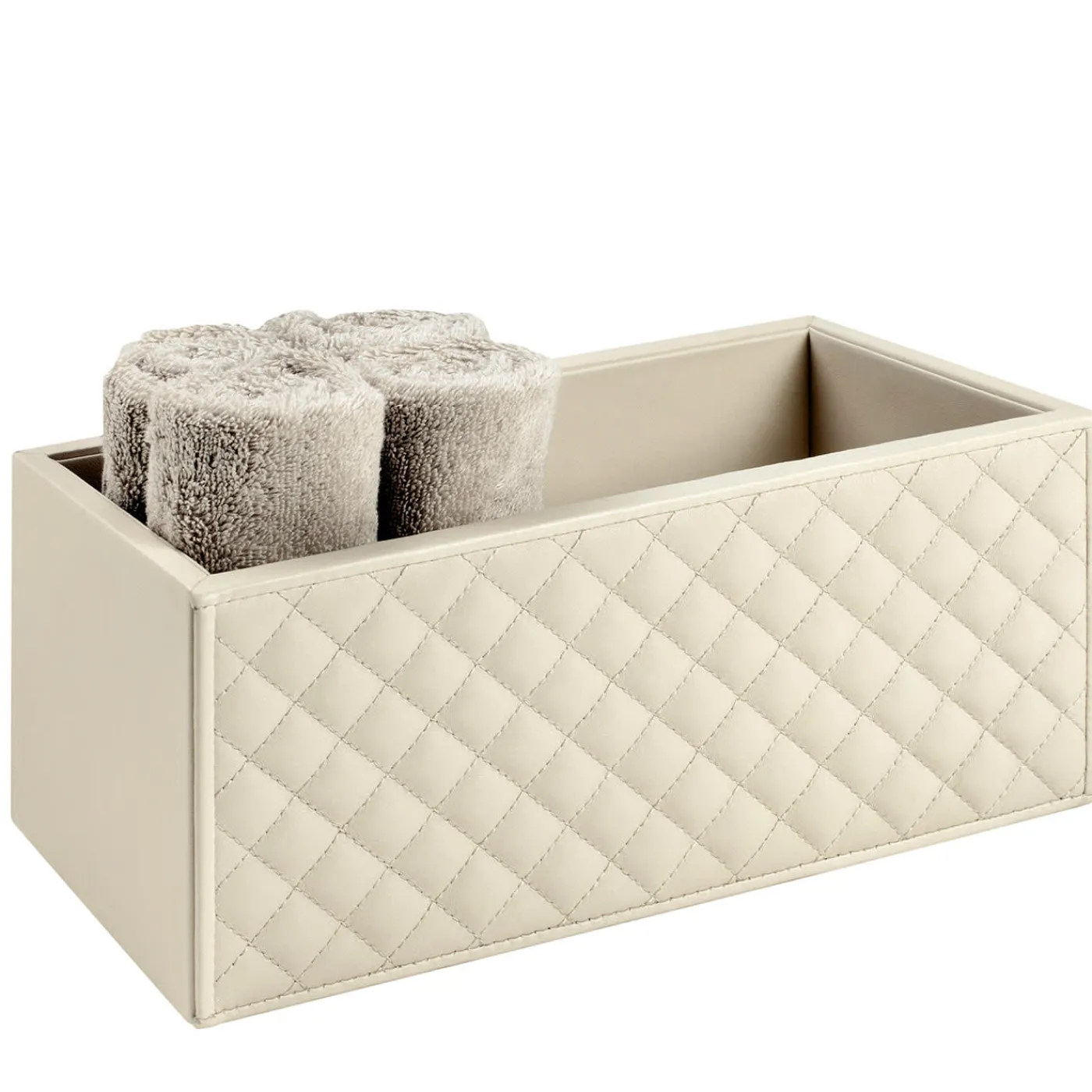 Contenitore multiuso, in pelle trapuntata con diamanti. Il cestino Scilla è una soluzione elegante per tenere in ordine qualsiasi spazio con stile. Questa creazione vanta linee pulite e dettagli raffinati, frutto di un’eccellente lavorazione artigianale e della massima cura. Asciugamani non inclusi.