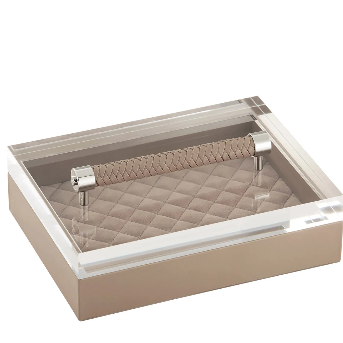 Questo elegante e versatile cofanetto rivestito in pelle, parte della Collezione Diana, è una testimonianza di raffinata artigianalità ed eleganza senza tempo. Vanta un coperchio in acrilico con una maniglia in pelle intrecciata a mano e una fodera imbottita di diamanti trapuntati.