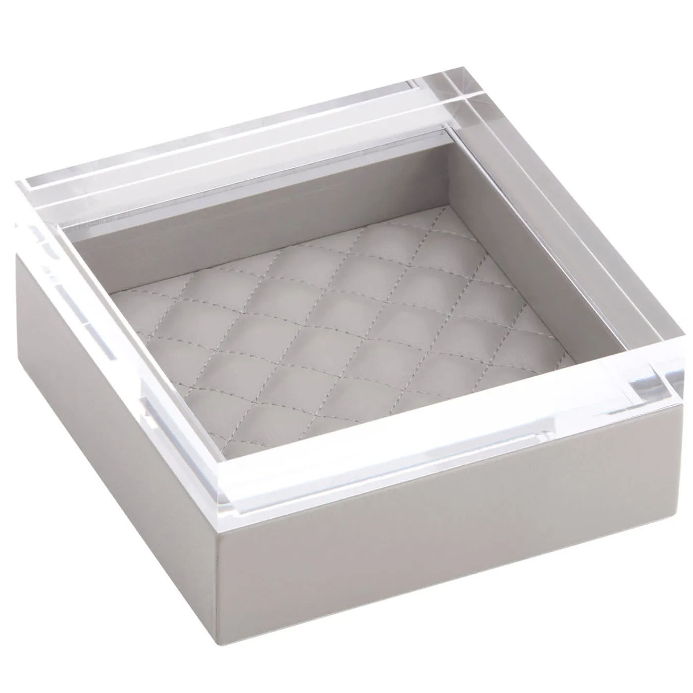 La scatola in pelle Febe è disponibile in diverse dimensioni e vanta un coperchio in acrilico. Internamente ha una fodera trapuntata con imbottitura a rombi. È perfetta per tutti i tipi di decorazioni e ambienti, da quelli classici a quelli moderni.