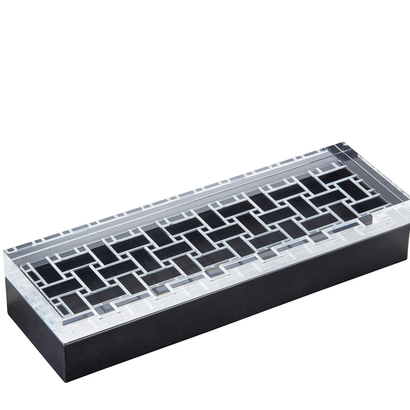 Scatola in pelle con coperchio in acrilico intagliato, motivo a onde di cesto. La forma semplice e pratica permette a queste scatole di essere il contenitore perfetto per gingilli e altri beni, aggiungendo un tocco prezioso a qualsiasi interno.