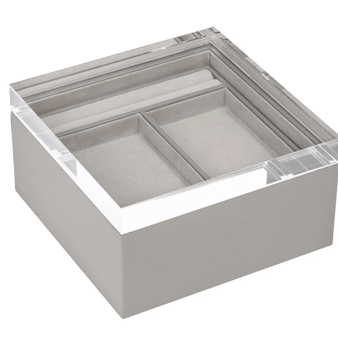 Portagioie in pelle con vassoio rimovibile, rivestimento in pelle scamosciata e coperchio in acrilico liscio. È una soluzione elegante per esporre i gioielli e aggiungere un accento sofisticato a un comò o a una vanità.