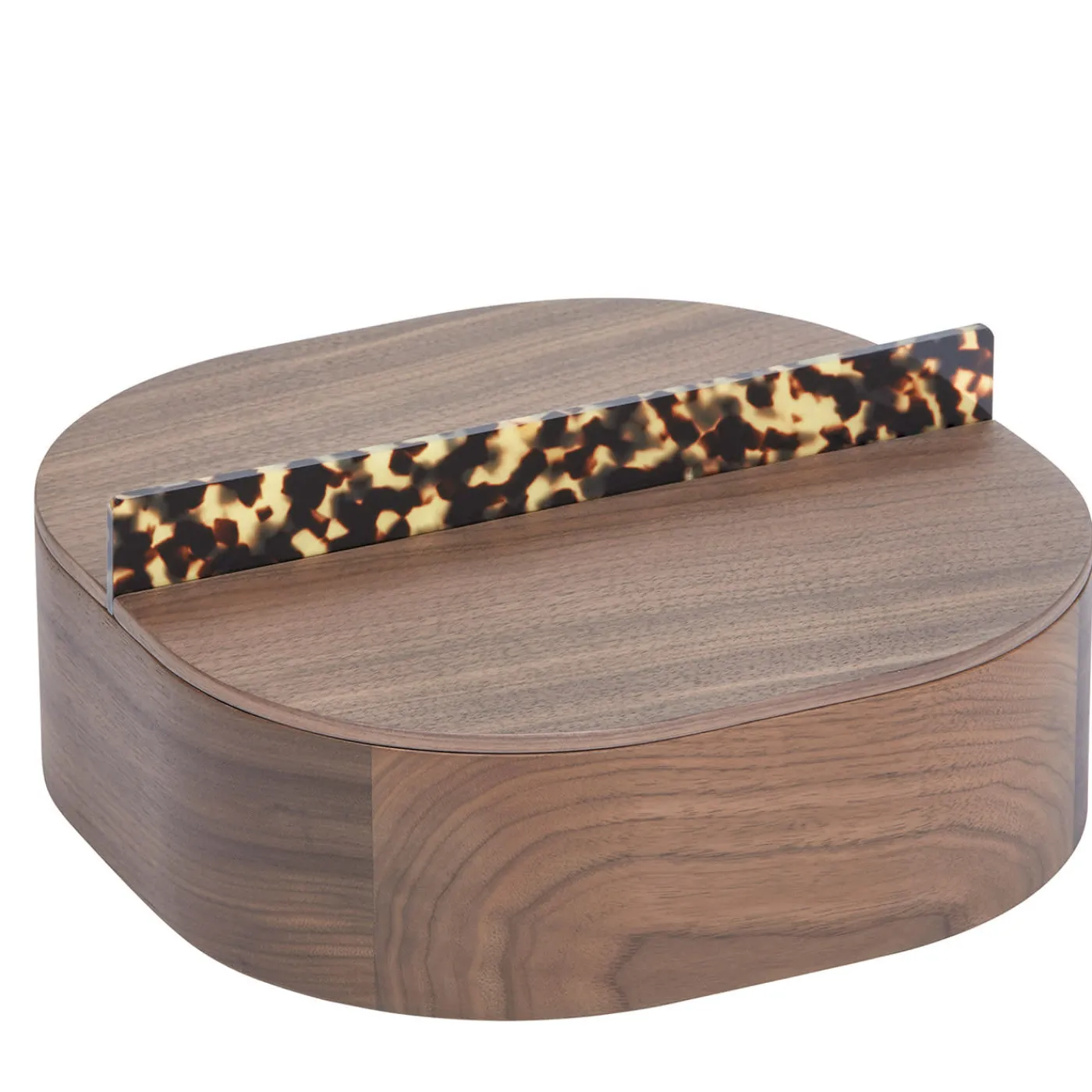 Struttura in legno disponibile in due finiture con manici in acetato tartarugato.