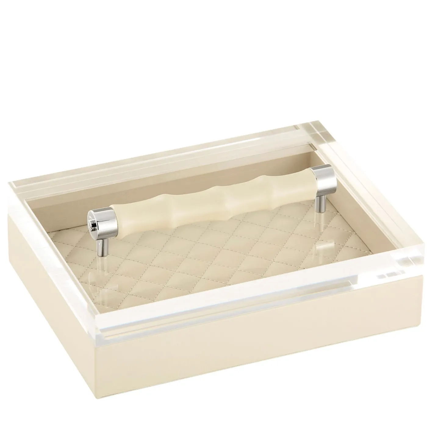 Questo elegante e versatile cofanetto rivestito in pelle, parte della Collezione Lea, è una testimonianza di raffinata artigianalità ed eleganza senza tempo. Vanta un coperchio in acrilico con manico in bambù rivestito in pelle e una fodera imbottita di diamanti trapuntati.