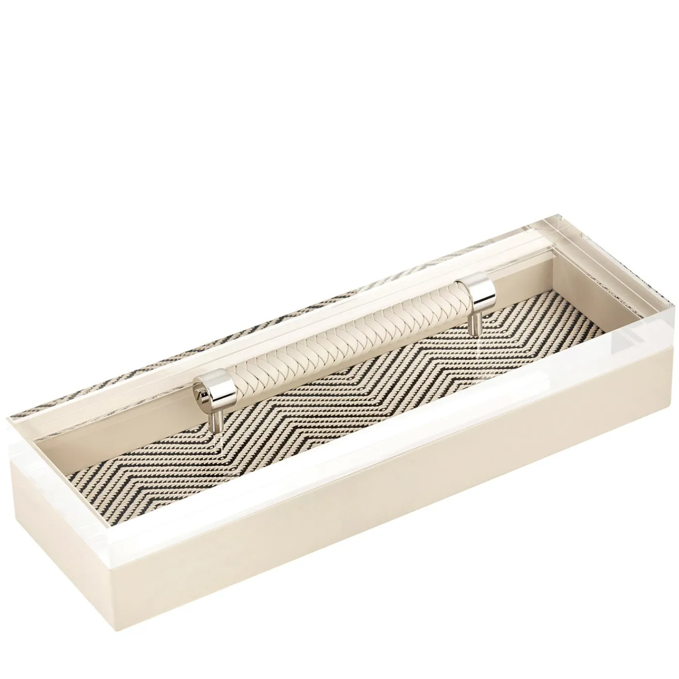 Questo elegante e versatile cofanetto rivestito in pelle, parte della Collezione Diana, è una testimonianza di raffinata artigianalità ed eleganza senza tempo. Vanta un coperchio in acrilico con una maniglia in pelle intrecciata a mano e una fodera in cotone cerato a spina di pesce.