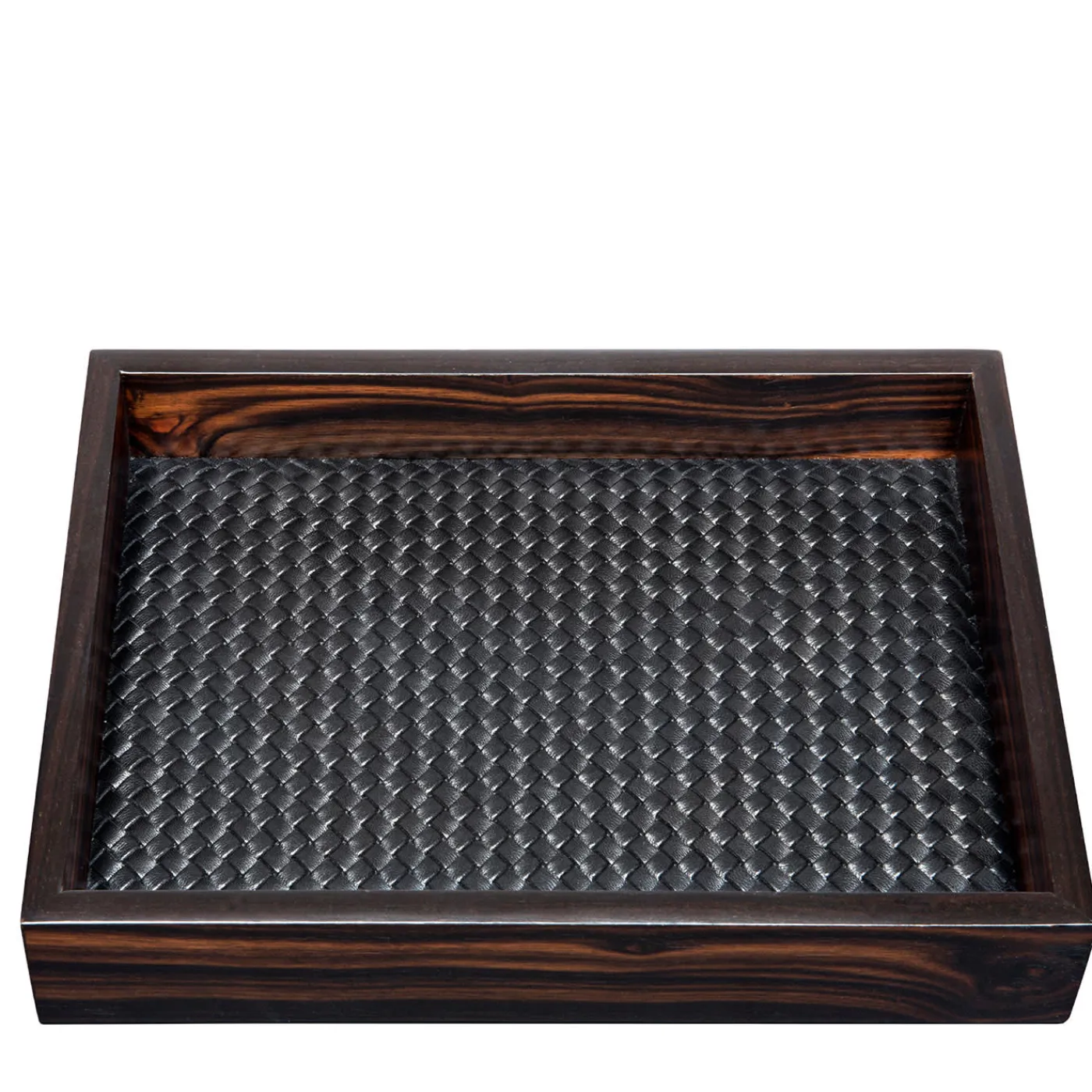 Il vassoio rettangolare Febe in ebano macassar, con fodera imbottita intrecciata a mano, è una sintesi perfetta tra estetica e funzionalità. Un oggetto di design capace di conferire all’ambiente circostante stile e personalità.