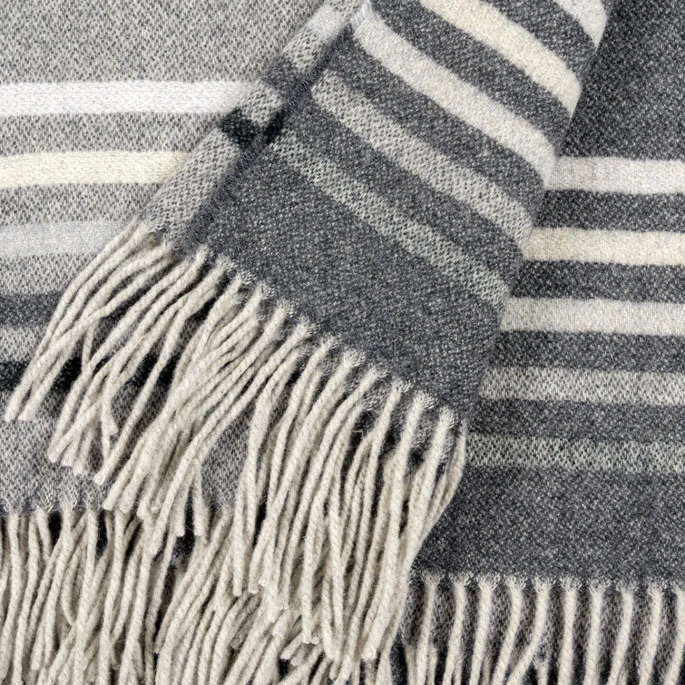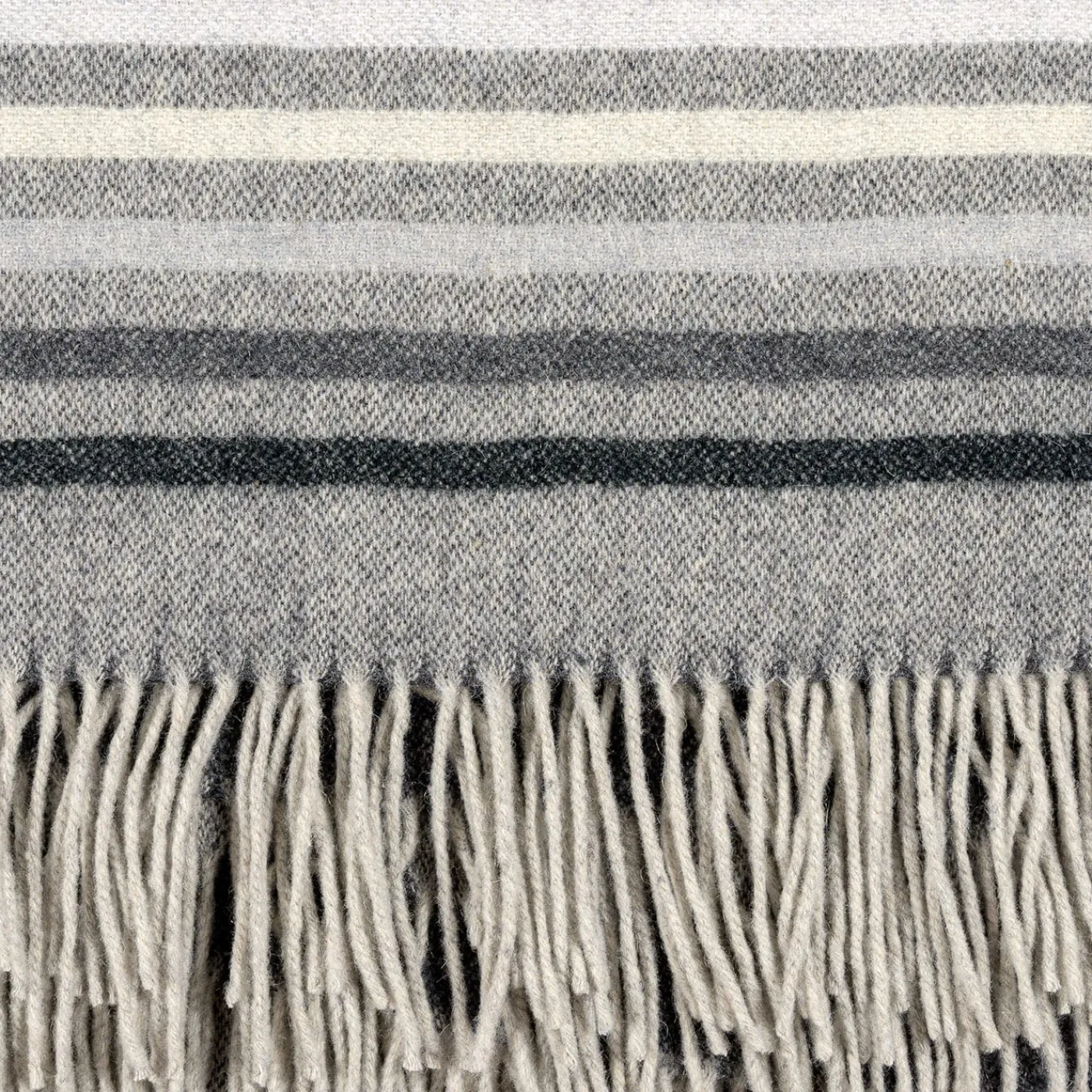 L’eleganza senza sforzo di decorazioni tranquille, tonalità neutre e qualità sartoriale è sintetizzata in questa piccola coperta unica. Ottenuta mescolando tipi selezionati e pregiati di cashmere (55%) e lana Merino (45%), è ravvivata da frange e strisce in una tavolozza di grigi. È un complemento elegante per arredamenti classici e contemporanei.