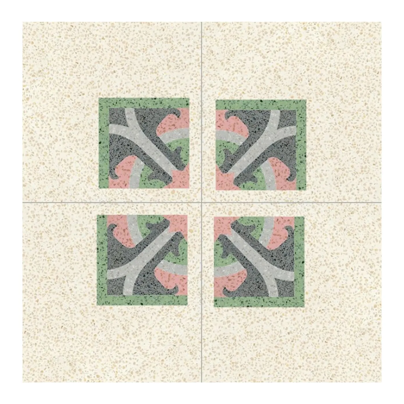 Realizzati a mano nel laboratorio siciliano di Romano utilizzando tecniche tradizionali, questi pavimenti in terrazzo sono realizzati con un’attenta miscela di cemento, granuli di marmo e sabbia vulcanica dell’Etna. Ogni piastrella è decorata a mano con un motivo geometrico che presenta forme quadrate in verde, grigio e rosa antico, su uno sfondo raffinato di bianco perla—una vera vetrina della maestria artigianale. Le piastrelle sono vendute al metro quadrato, con ogni metro quadrato che include 25 piastrelle.