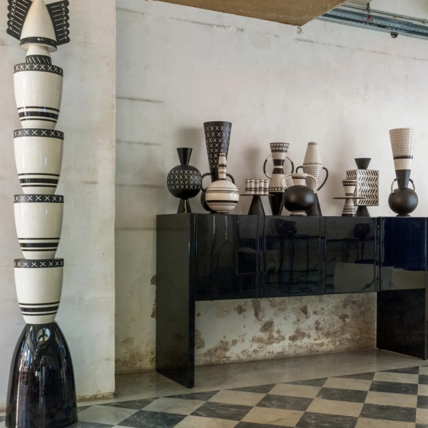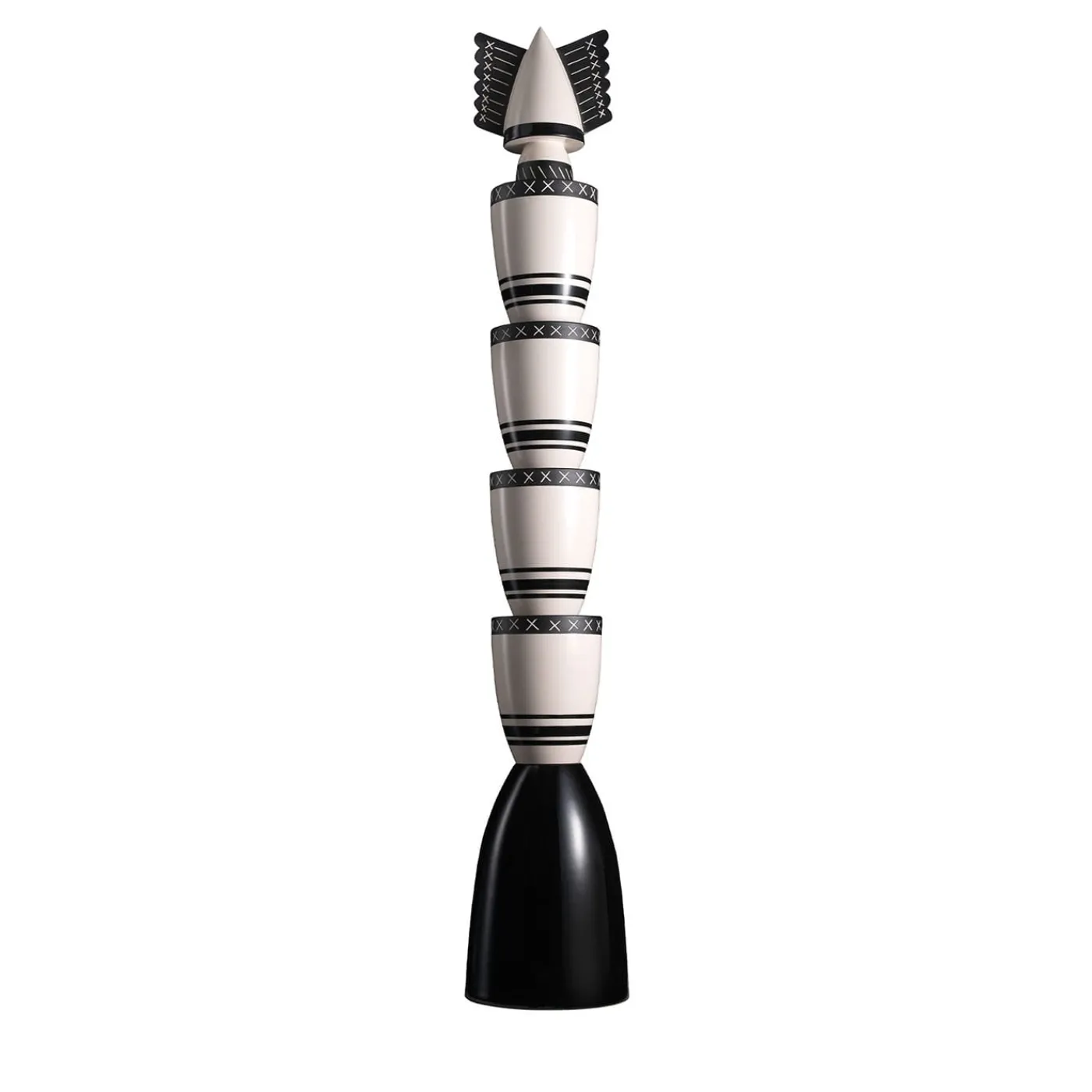 Velocità in bianco e nero. Una danza a ritmo tribale, seguendo geometrie e architetture magiche dove si fondono energie e anime. Vasi conici e sferici giocano con linee e croci in un rituale in bianco e nero. Questo totem, composto da sei pezzi di argilla fatti a mano, presenta uno smalto nero opaco, una barbottina bianca dipinta con accenti neri e una finitura cristallina trasparente. Edizione limitata di 9 pezzi, disegnata da Ugo La Pietra.