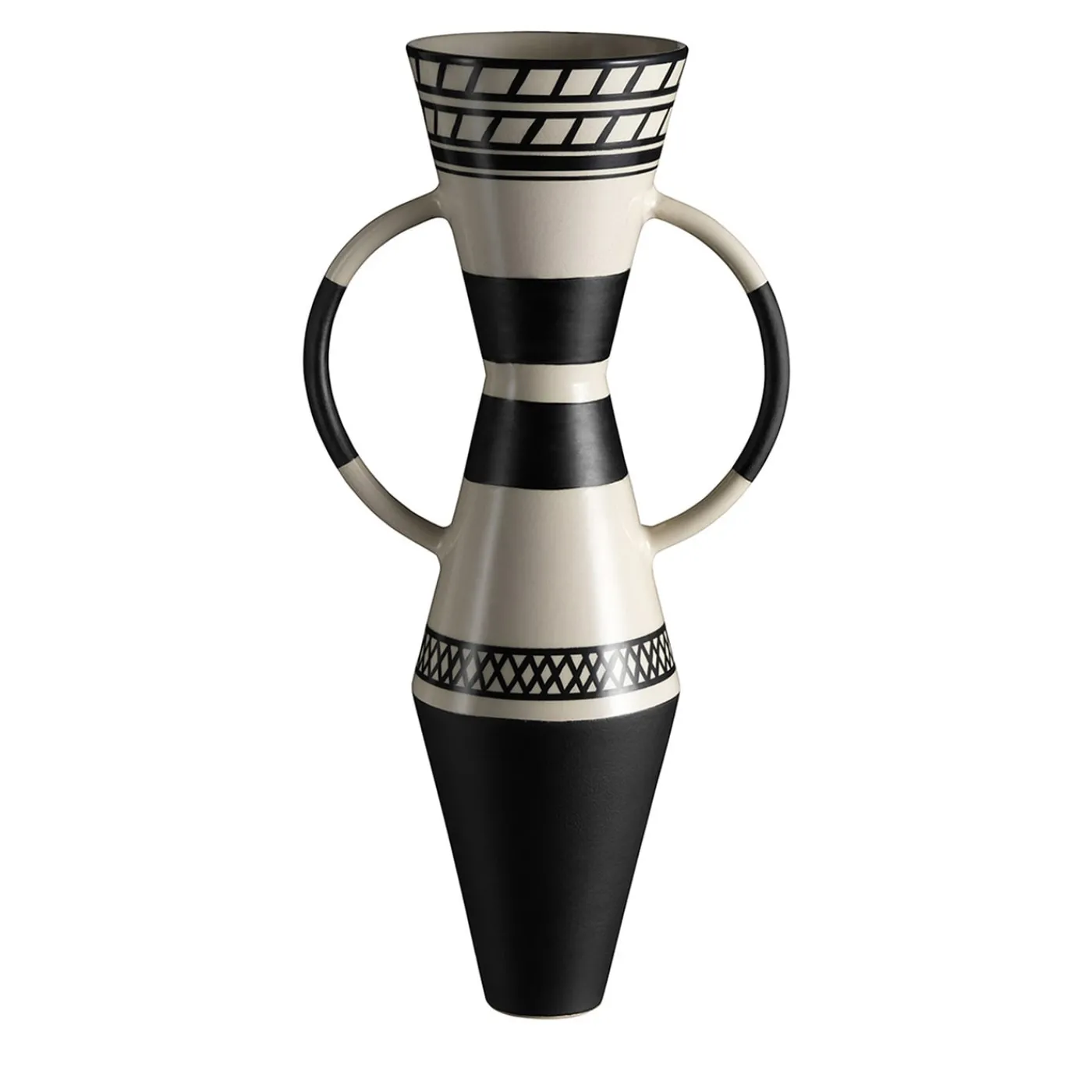 Vasi conici e sferoidali giocano con linee e croci in un rituale in bianco e nero. Vaso in argilla, gettato a mano, con manici in argilla. Finitura a smalto nero opaco per la base e i manici, ingobbio bianco decorato nero con smalto trasparente per il corpo. Disegnato da Ugo La Pietra