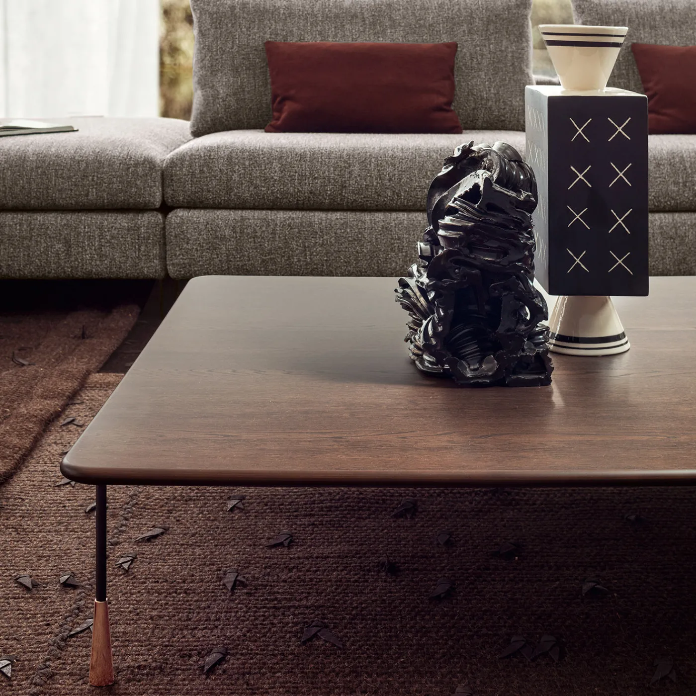 Vasi conici e sferoidali giocano con linee e croci in un rituale bianco e nero. Vaso quadrato in argilla bianca, colato a mano, con finitura ingobbiata bianca e decorato in nero con smalto trasparente per la base e la parte superiore, smalto nero opaco e decorazione con croci ingobbiate bianche per il corpo. Disegnato da Ugo La Pietra