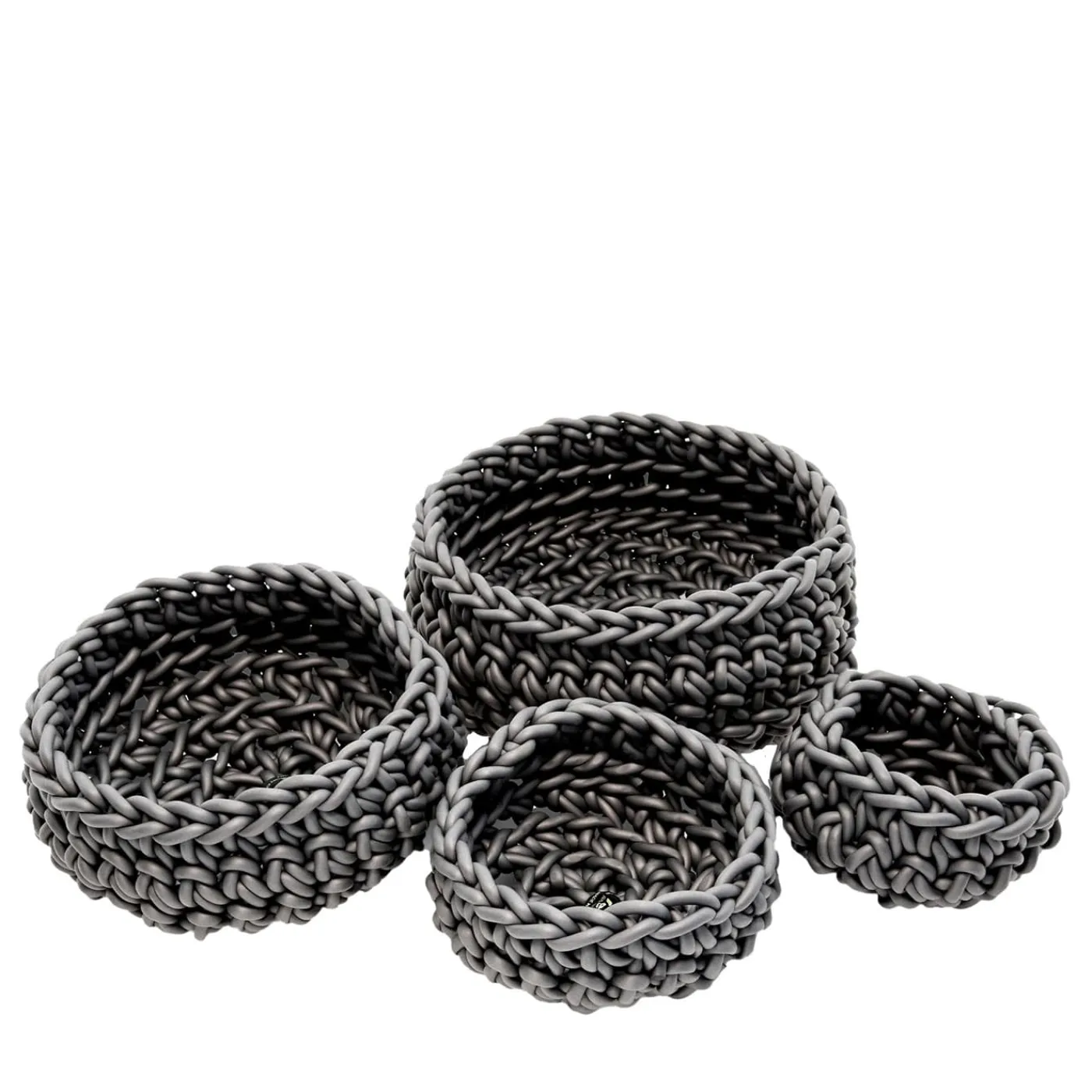 Un set squisito per decorare con stile un ambiente contemporaneo: questi quattro cestini hanno forme diverse e sono realizzati a mano in neoprene impermeabile grigio di 8 mm di spessore. Adatti sia per interni che per esterni, sono disponibili in varie dimensioni e colori. Per le opzioni disponibili, consultare il catalogo Artemest.