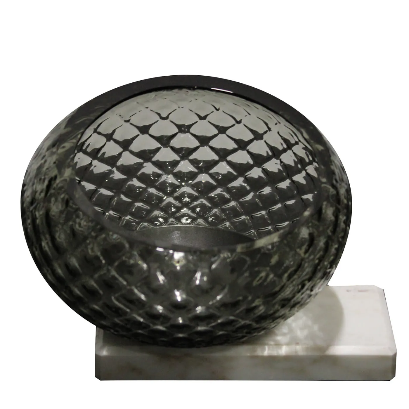 Parte della collezione Delaìra, questo pezzo rappresenta appieno la maestria dei vetrai veneziani. La sfera di vetro è tagliata in diagonale e poggia delicatamente sulla base in marmo Calacatta oro, creando un elegante contrasto.