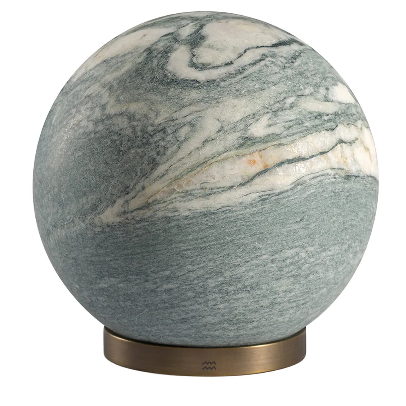 Questo superbo fermacarte della collezione Gravity Zodiac è un’aggiunta accattivante a uno studio privato o a uno spazio abitativo, altrettanto straordinaria come semplice elemento decorativo. Realizzata in marmo Cremo Tirreno – estratto dalle Alpi Apuane vicino alla costa tirrenica italiana – la sfera colpisce per le sue uniche e intense traccie verdi, che emergono da uno sfondo beige volto a ricreare l’aspetto blu-verde di Urano. Il simbolo dell’Acquario è impresso sulla base.
