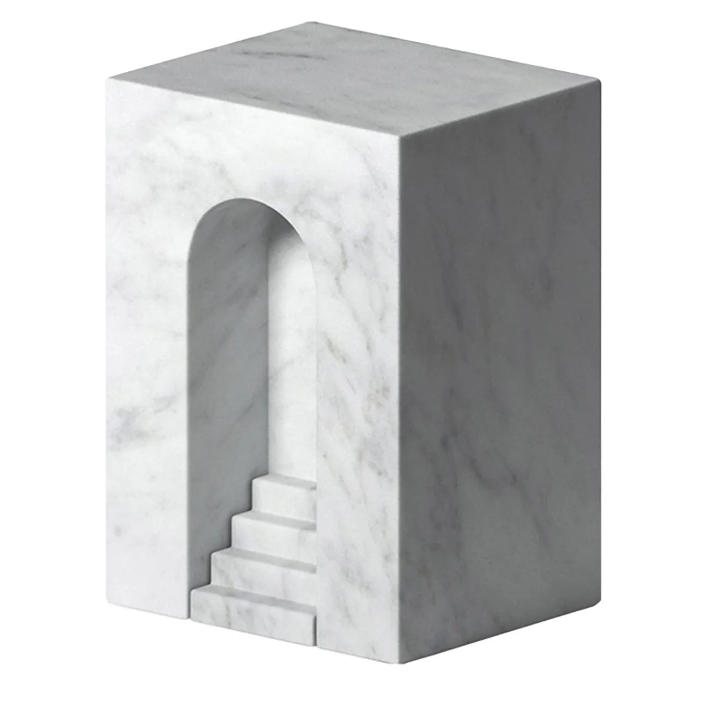 Parte di The Village Collection, questa superba scultura in marmo bianco di Carrara è una celebrazione dell’architettura utopica, progettata come parte di una serie di progetti a forma di casa ispirati al nuovo valore più intimo dato alle case come risultato della rigida reclusione vissuta nel 2020. È composta da una struttura a forma di cubo su cui si appoggia una scala artistica che conduce a uno spazio vuoto, sottolineando l’estro concettuale dell’opera.