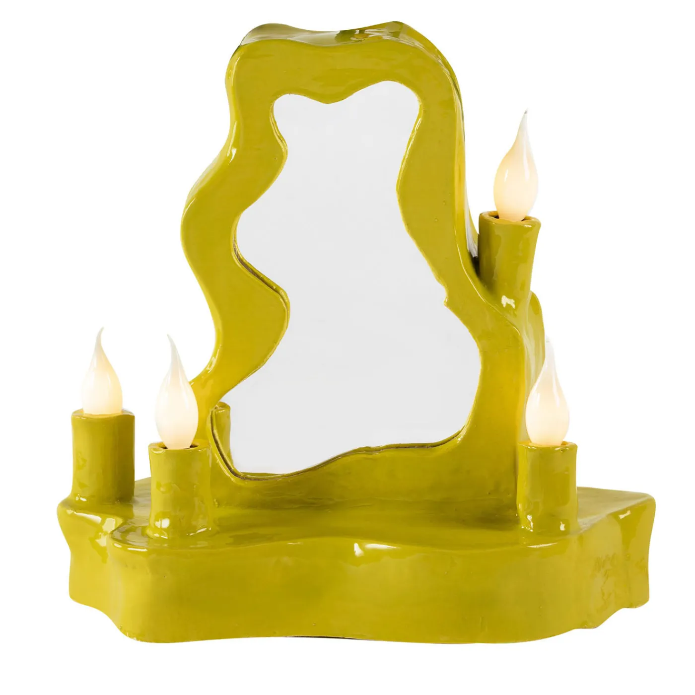 Uno specchio da tavolo illuminato in ceramica gialla con una silhouette organica ispirata alle nuvole, caratterizzato da forme dolcemente irregolari che esaltano il suo calore nostalgico. Progettato per evocare la sensazione di giornate estive trascorse sdraiati sull’erba, questo pezzo integra quattro luci a forma di fiamma, fondendo l’illuminazione decorativa con la riflessione pratica. Fa parte della collezione “Can You Imagine?” che esplora la creatività attraverso forme poetiche ispirate alla natura, lo specchio invita a un’interazione immaginativa oltre la sua superficie. Le lampadine non sono incluse. Edizione limitata di 9 pezzi.