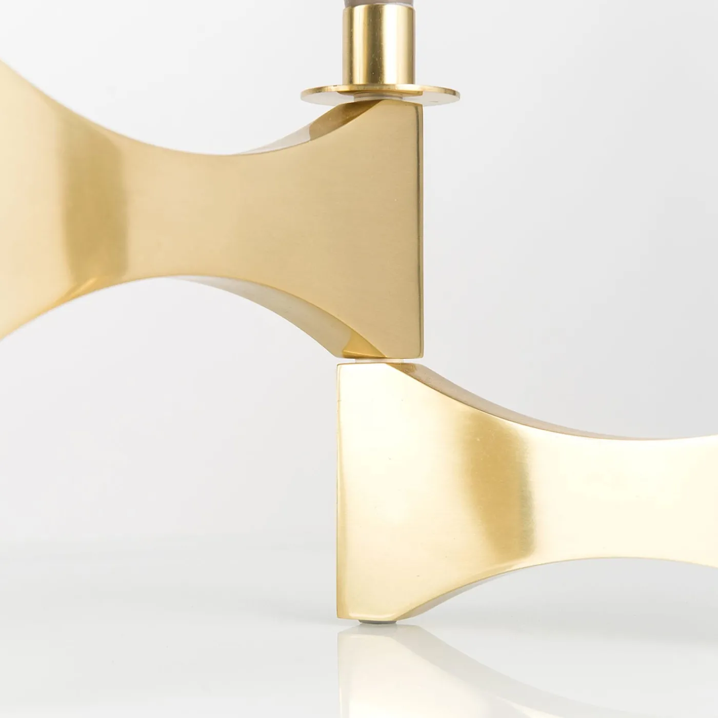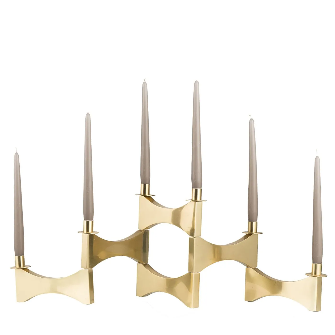 Questo portacandele è realizzato in fusione di ottone naturale protetto, per offrire una base robusta ed elegante. È dotato di sei bracci graziosamente ricurvi e viene fornito con candele color avorio. Questo pezzo rappresenta una soluzione di illuminazione classica e versatile, adatta a diversi stili di arredamento, dal tradizionale al contemporaneo.