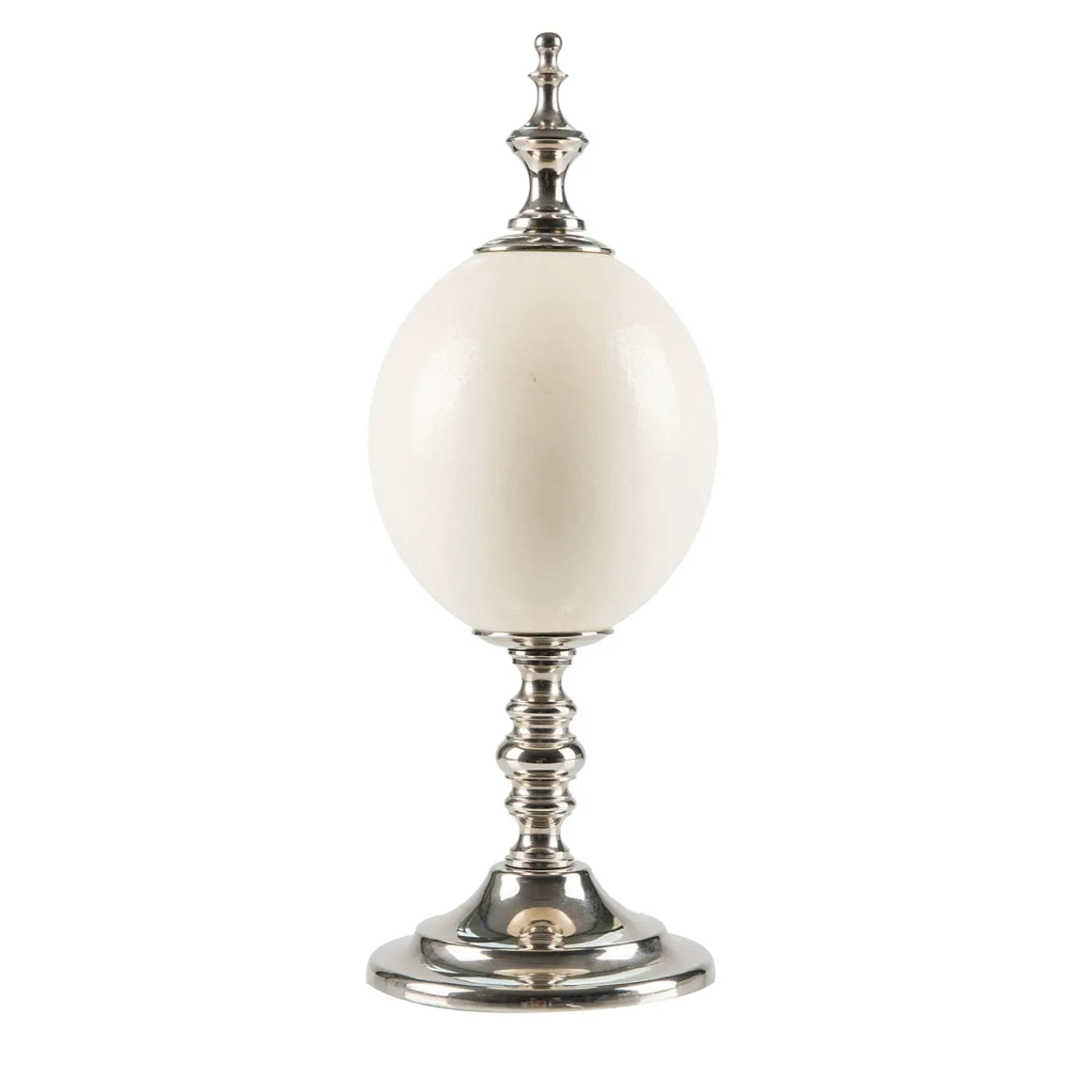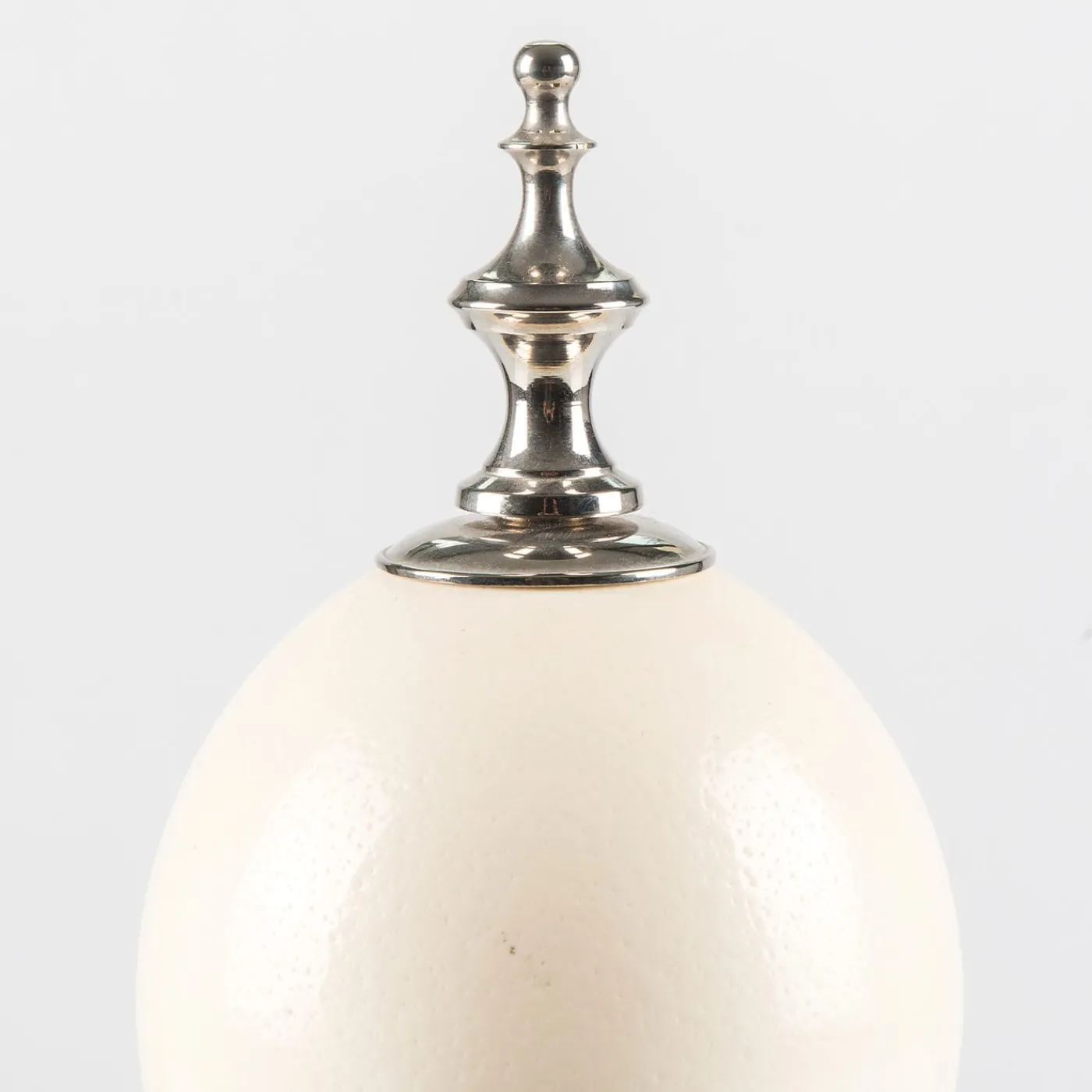 Fate una dichiarazione di design con questo accattivante espositore di uova di struzzo. Un vero uovo di struzzo, accuratamente selezionato per la sua qualità, è sapientemente montato su una base in ottone nichelato lucidato, meticolosamente lavorata. Questa combinazione crea un pezzo elegante e sobrio, che aggiunge un tocco di stile raffinato a qualsiasi ambiente.