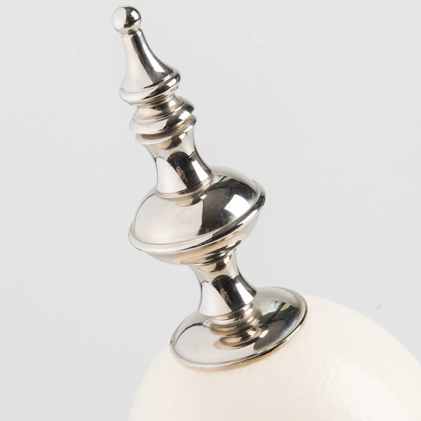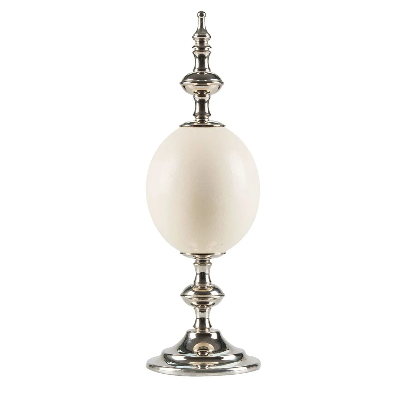 Fate una dichiarazione di design con questo accattivante espositore di uova di struzzo. Un vero uovo di struzzo, accuratamente selezionato per la sua qualità, è sapientemente montato su una base in ottone nichelato lucidato, meticolosamente lavorata. Questa combinazione crea un pezzo elegante e sobrio, che aggiunge un tocco di stile raffinato a qualsiasi ambiente.