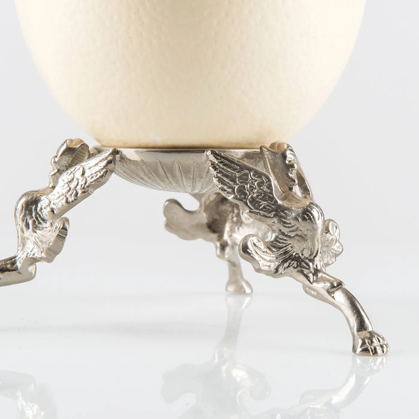 Celebrate la maestria dell’artigianato con questo uovo di struzzo unico e accattivante. Ogni delicato draghetto è meticolosamente cesellato a mano dall’ottone, mostrando incredibili dettagli e abilità artistiche. La finitura protetta in nichel lucido esalta l’intricato design, un connubio perfetto tra bellezza naturale e artigianato artistico, che aggiunge un tocco di intrigo e raffinatezza a qualsiasi spazio.