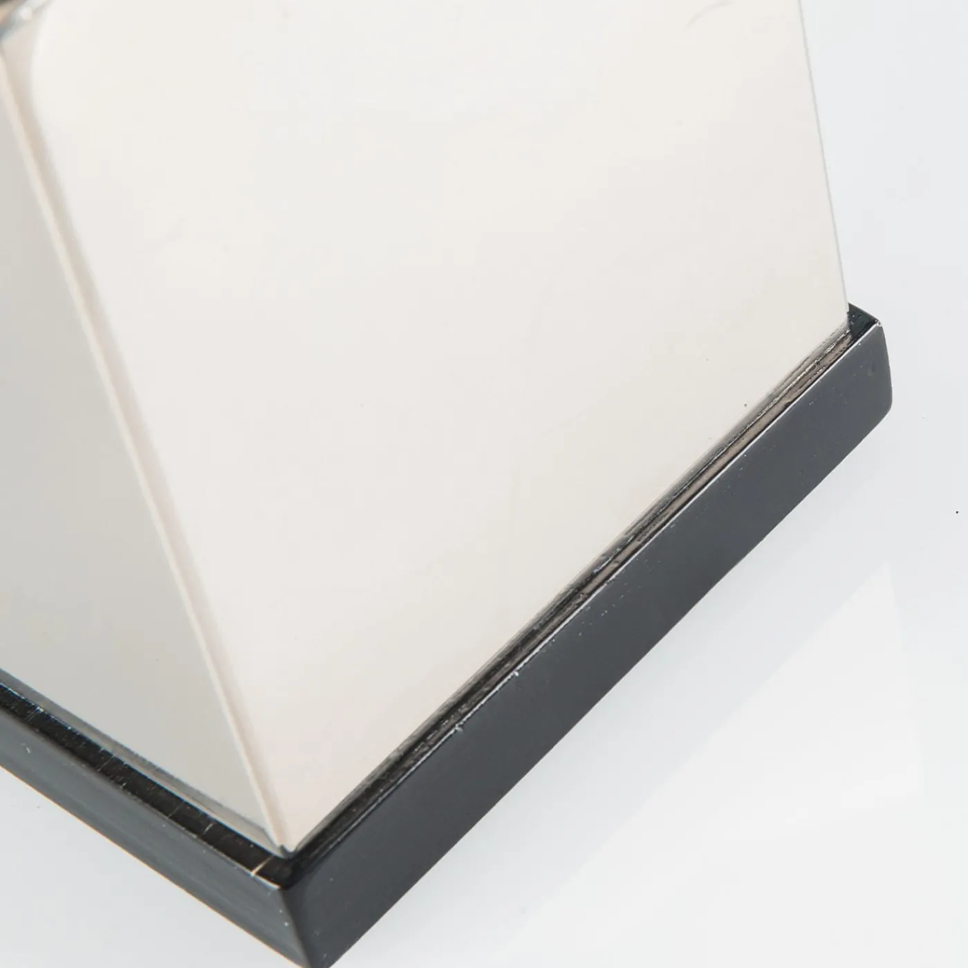 Questo corno di bufalo è stato accuratamente selezionato e artisticamente esposto su un cubo di ottone nichelato lucido, creando un contrasto sorprendente di texture e forme. La base in legno di quercia laccato nero costituisce una solida base che completa questo pezzo eccezionale.