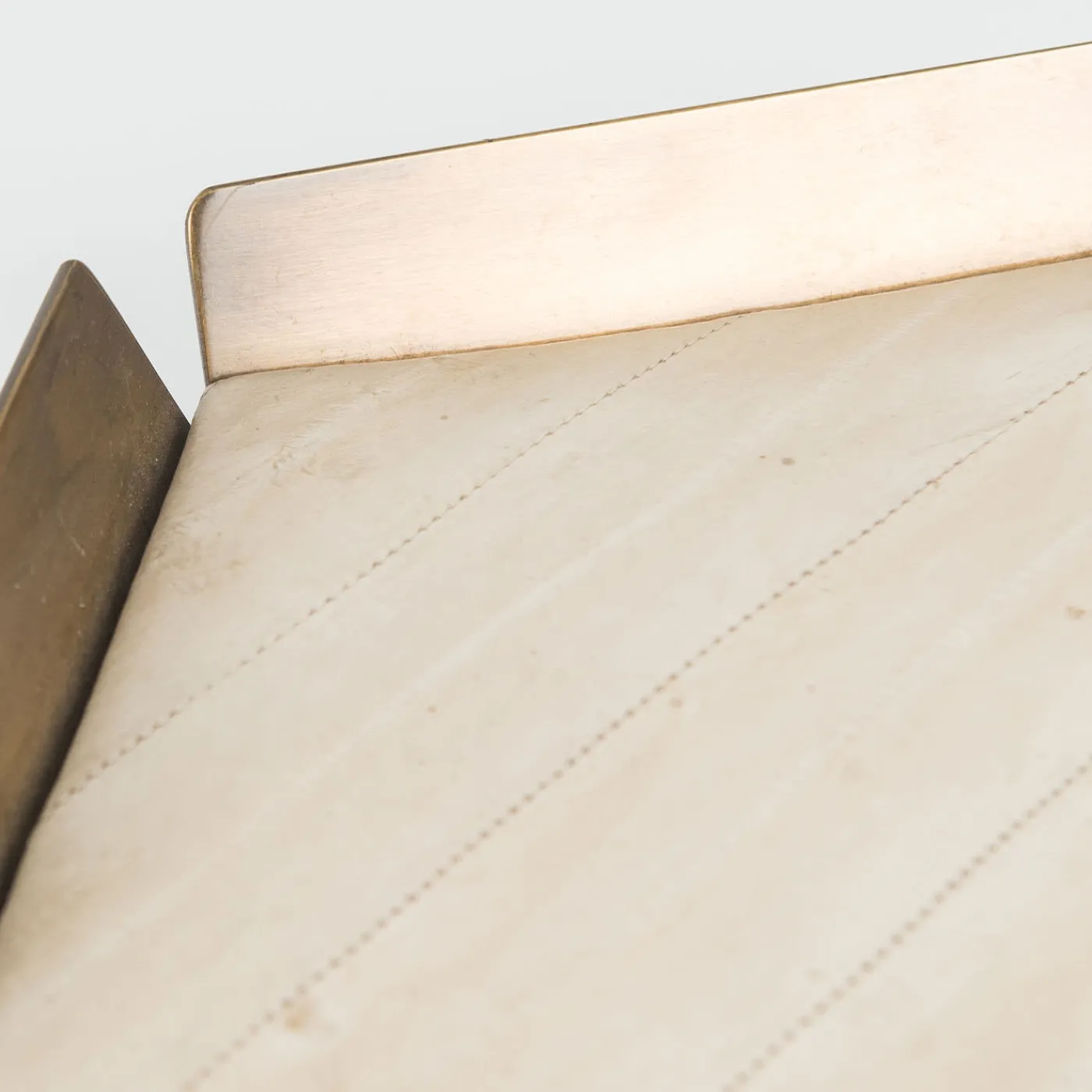 Realizzato in ottone brunito chiaro, questo elegante vassoio emana un lusso sobrio. L’imbottitura in vera pelle d’anguilla color crema aggiunge un tocco unico di consistenza e raffinatezza, rendendolo un’aggiunta perfetta a qualsiasi comò, comodino o ingresso.