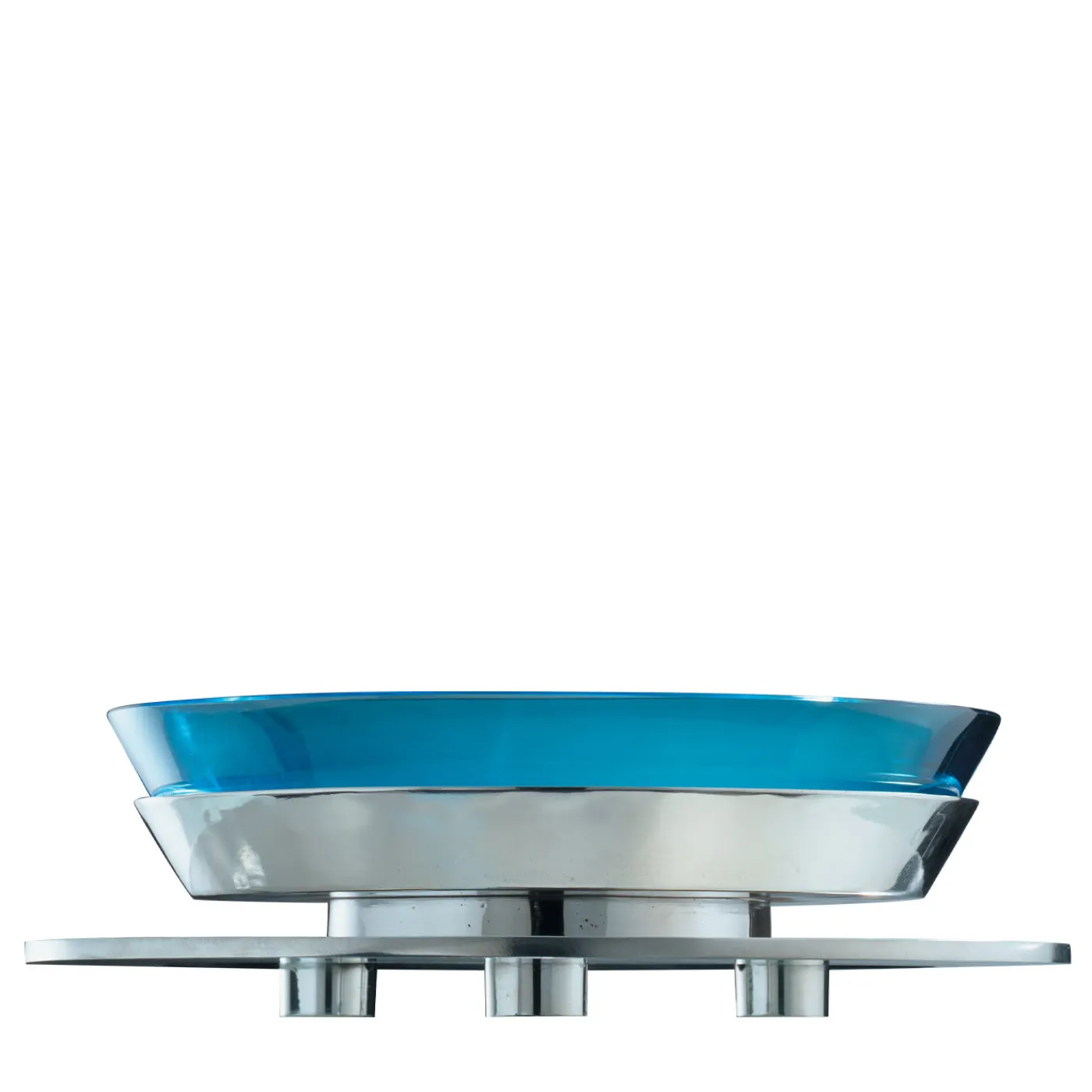 Superbamente realizzato e lucidato da mani esperte, questo splendido centrotavola è composto da una base in peltro che sostiene una magnifica sommità in vetro di Murano soffiato a bocca color acquamarina. Disegnato da per un’edizione limitata di 99 pezzi, questa opera d’arte da collezione eleverà l’aspetto di qualsiasi tavolo da pranzo, credenza o console.