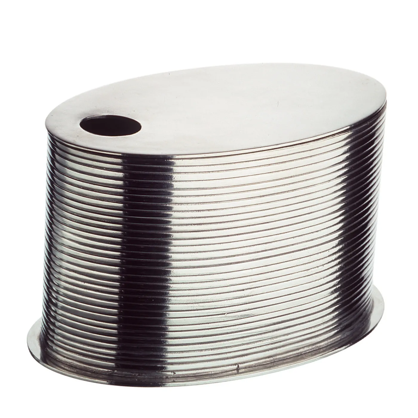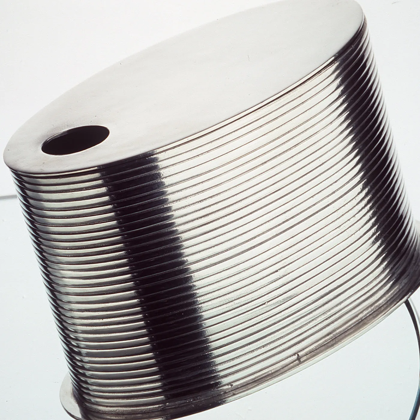 Parte del Progetto Metallia, questa scatola è un’edizione limitata disegnata da Mario Trimarchi e Marco Susani. Realizzata in metallo, la sua silhouette ovale è arricchita da una serie di scanalature che creano uno splendido gioco di luci e ombre. Il coperchio è liscio e dotato di un foro che ne facilita l’apertura.